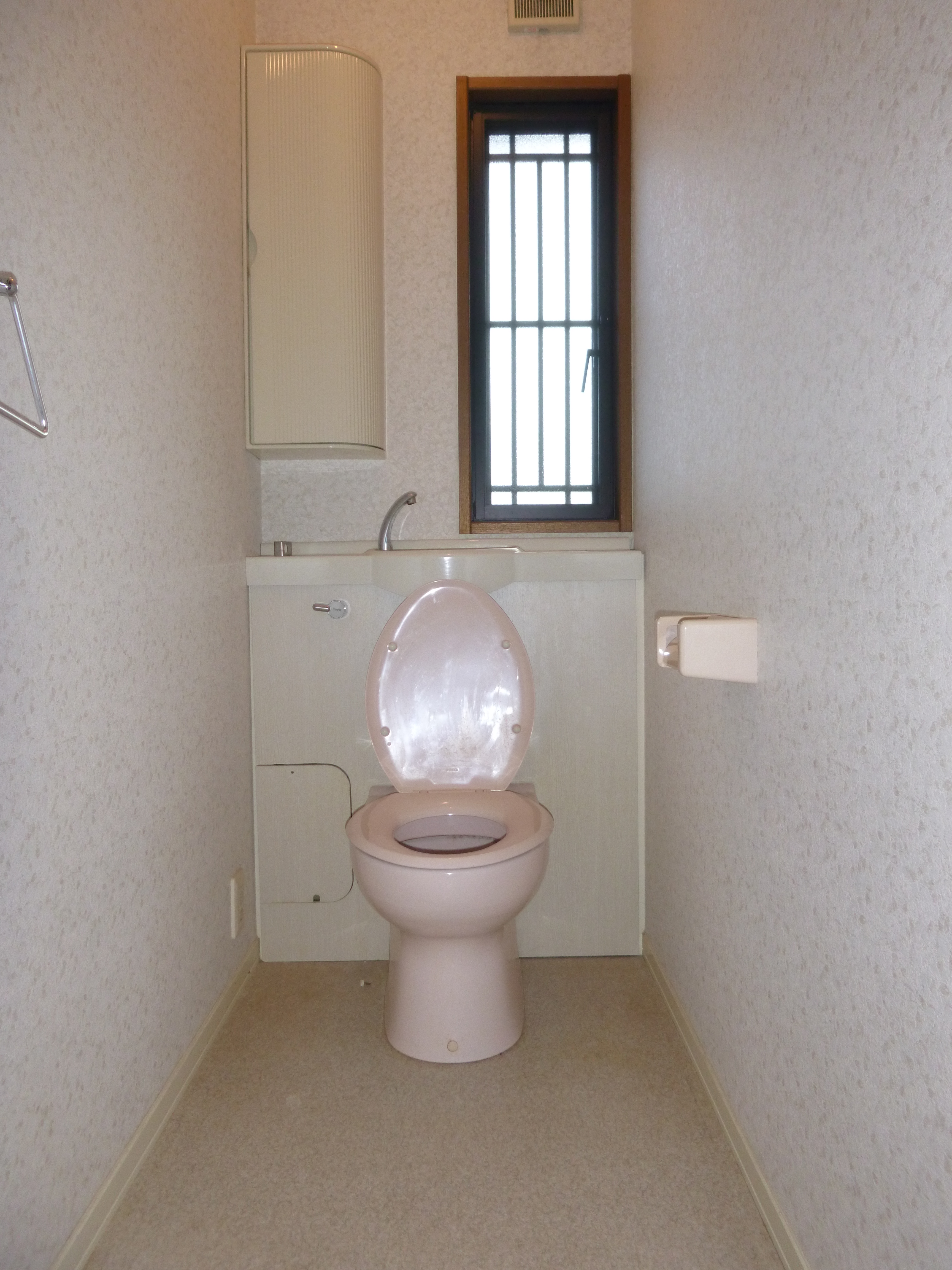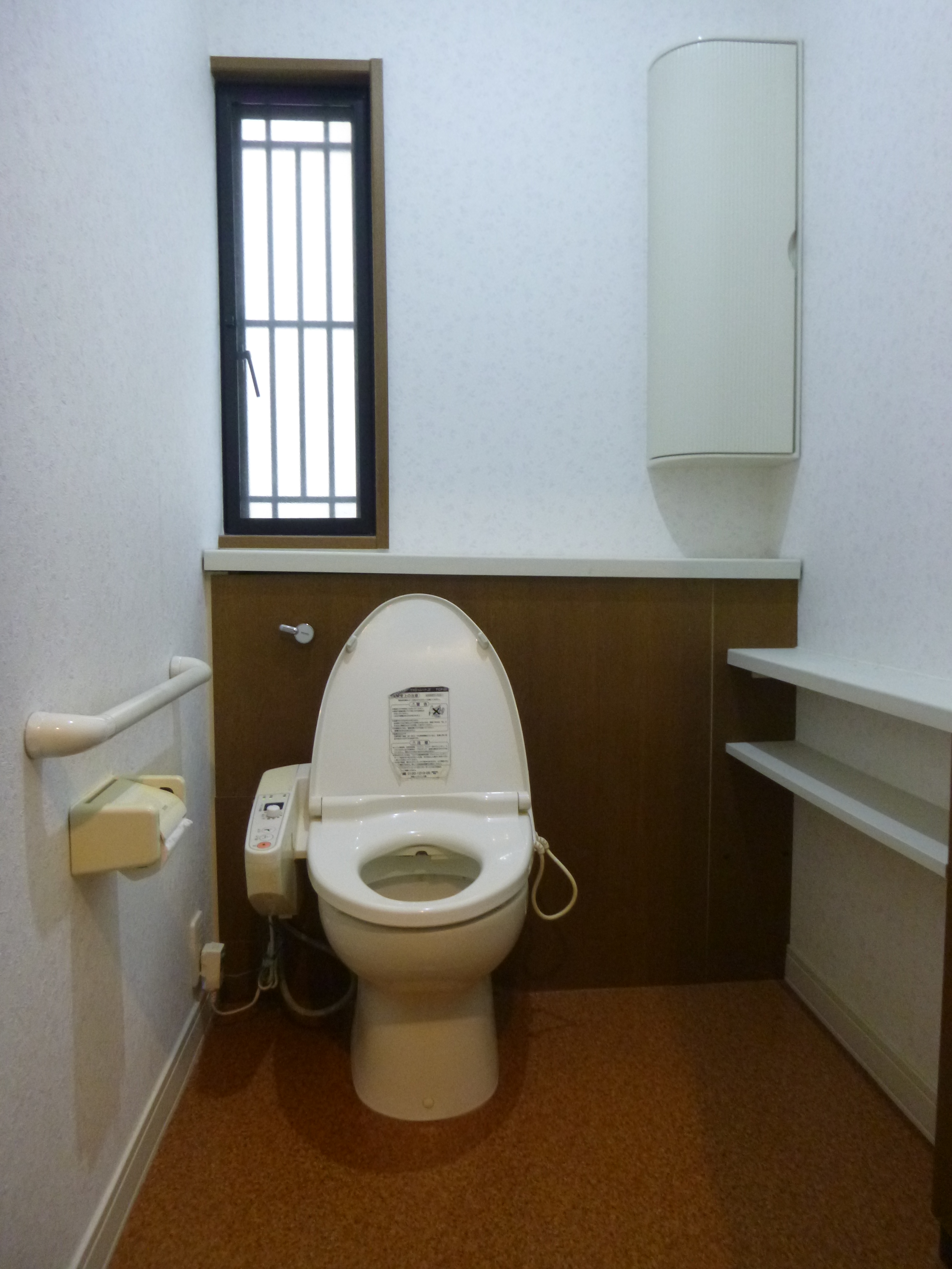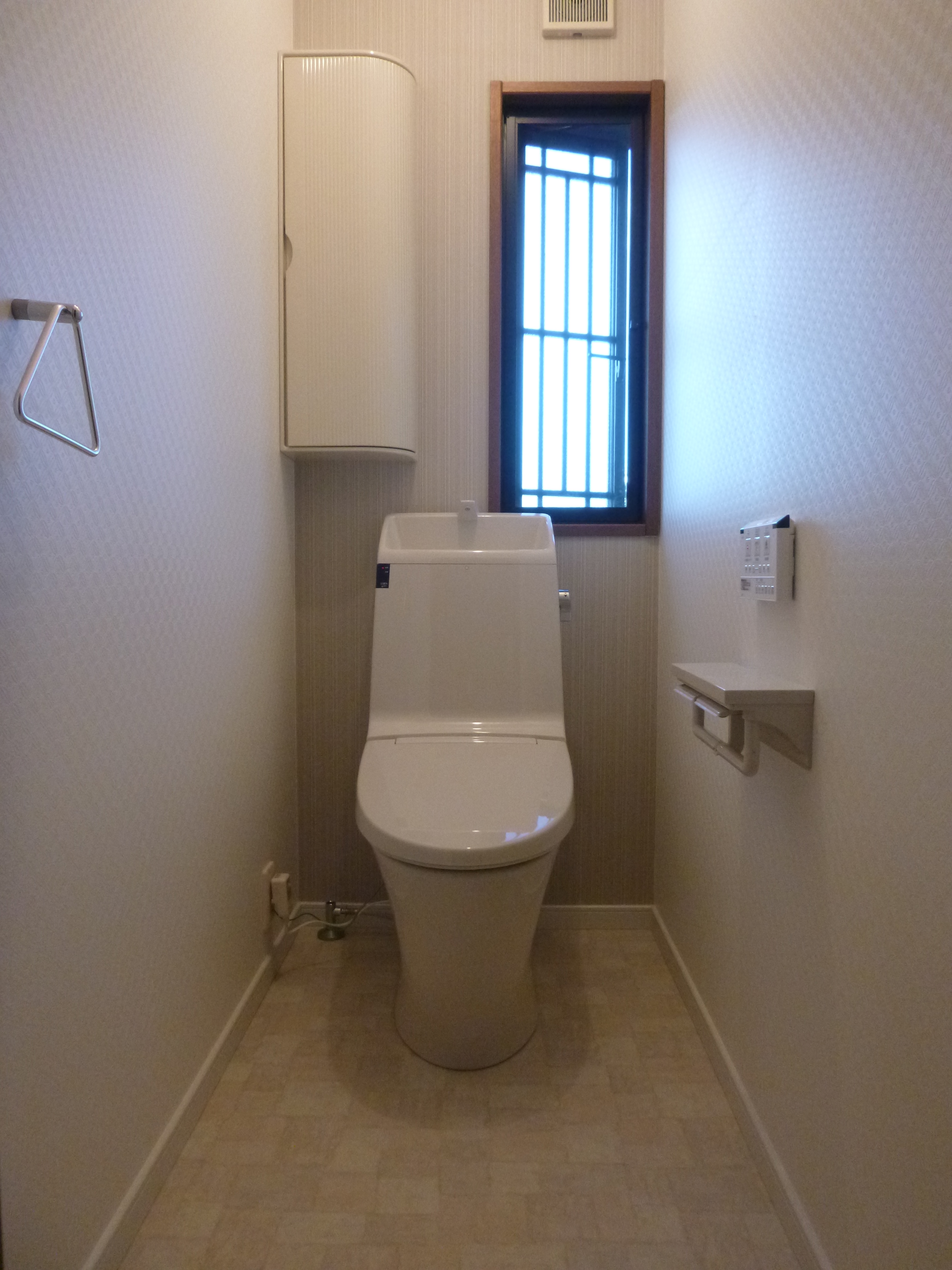 1Fトイレはリクシルの最新便器「サティスG」。キャパシアの手洗付収納にエコカラットをプラスしてリニューアル。