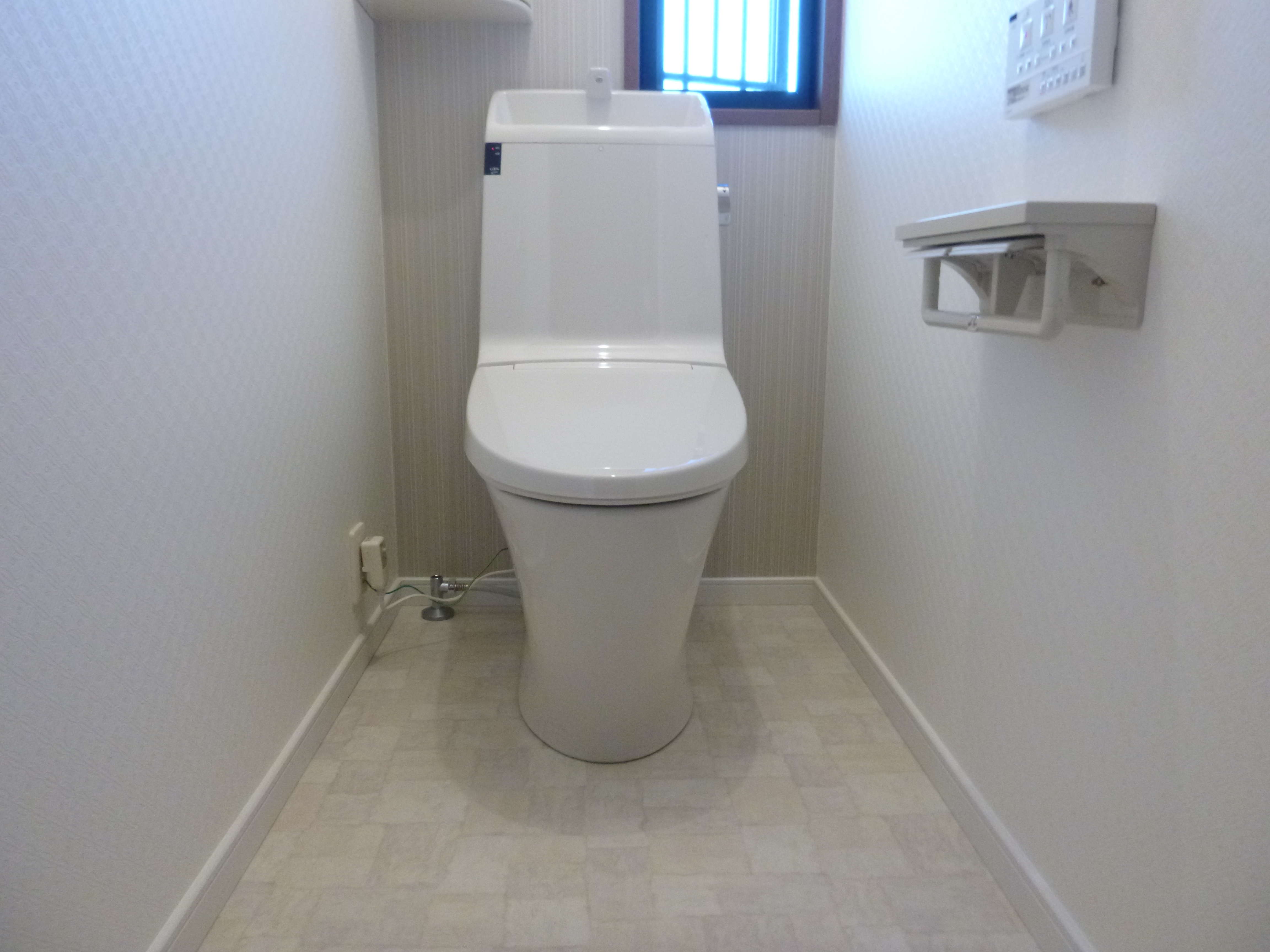 施主様からの「お手入れが簡単に」というご希望通り、フチレスはふちが無くお掃除も簡 単!サティスGはプラズマクラスターで鉢内除菌もできる上、プロガード加工でキレイが長持ち。お掃除リフトアップ機能でスキマの汚れも奥まで楽に拭き取れます。 便器交換だけでなく、節水による省エネ効果や機能も充実、そしてトイレ空間も素敵にリニューアルしました。 初回は2階トイレ工事。旧腰壁タンクの撤去工事、床・壁の貼り換え工事、新トイレ(アメージュZフチレス)の設置を行いました。 いくつもの作業工程を監督が仕切り、1日で工事を完了することができました。 二度目の工事は1階のトイレ工事。便器交換、床・壁の貼り換え工事に加え、手洗付収納キャビネットの設置とエコカラットといった内容で、快適でキレイなトイレ空間が造りあがりました。