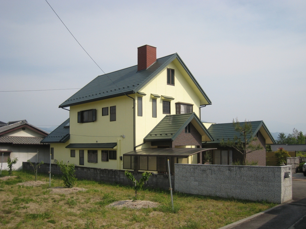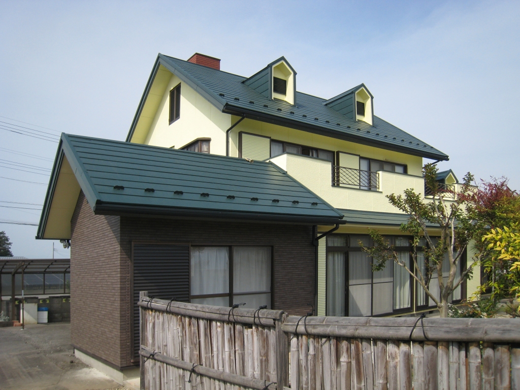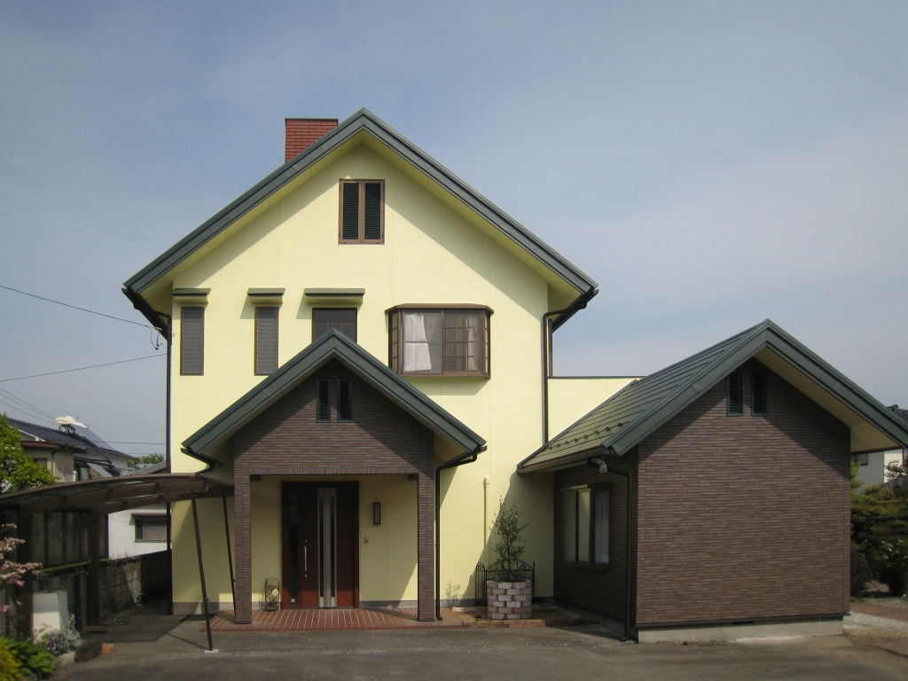 スレート屋根や外壁の塗装に汚れや劣化が見られるようになってきた外観をリニューアル。今後のメンテナンスコストを抑えるために屋根はガルバリウム鋼板へ重ね葺き、外壁はシリコン塗装で塗り替えました。玄関まわりと南側外壁はサイディング貼りでアクセント。全体的には『赤毛のアンの家』をイメージしながら、お客様のこだわりを色で表現しました。