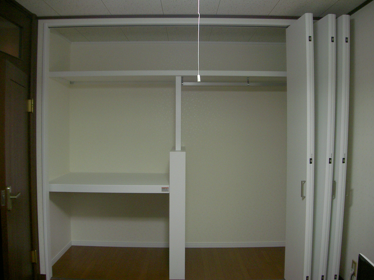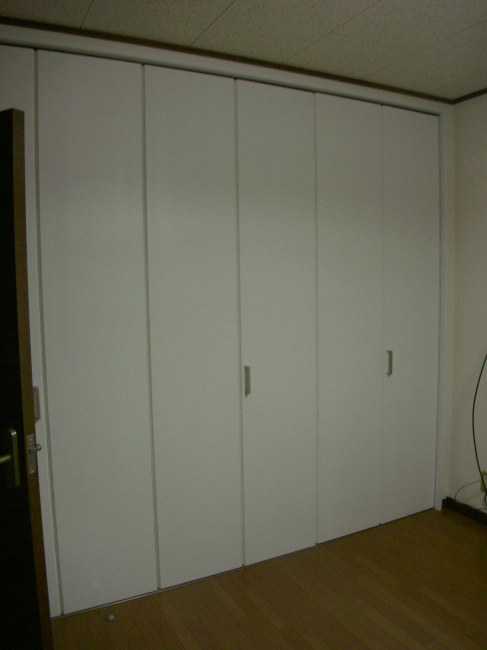 2室に仕切るつもりで各室の建具は設置済みであった洋室の間仕切り工事。壁にプラスして収納スペースを設けました。何を収めるかを入念にご検討され、半分を布団・半分を洋服などの収納にしました。折れ戸は高さもあり可動タイプなので、物の出し入れがとてもしやすく施主様にも喜んでいただけました。それから今回の工事と共に、リビングの窓下の焼け部分も見違えるほどきれいになりご満足をいただけました。それと和室の障子部分の敷居も洗い・磨ききれいになりました。