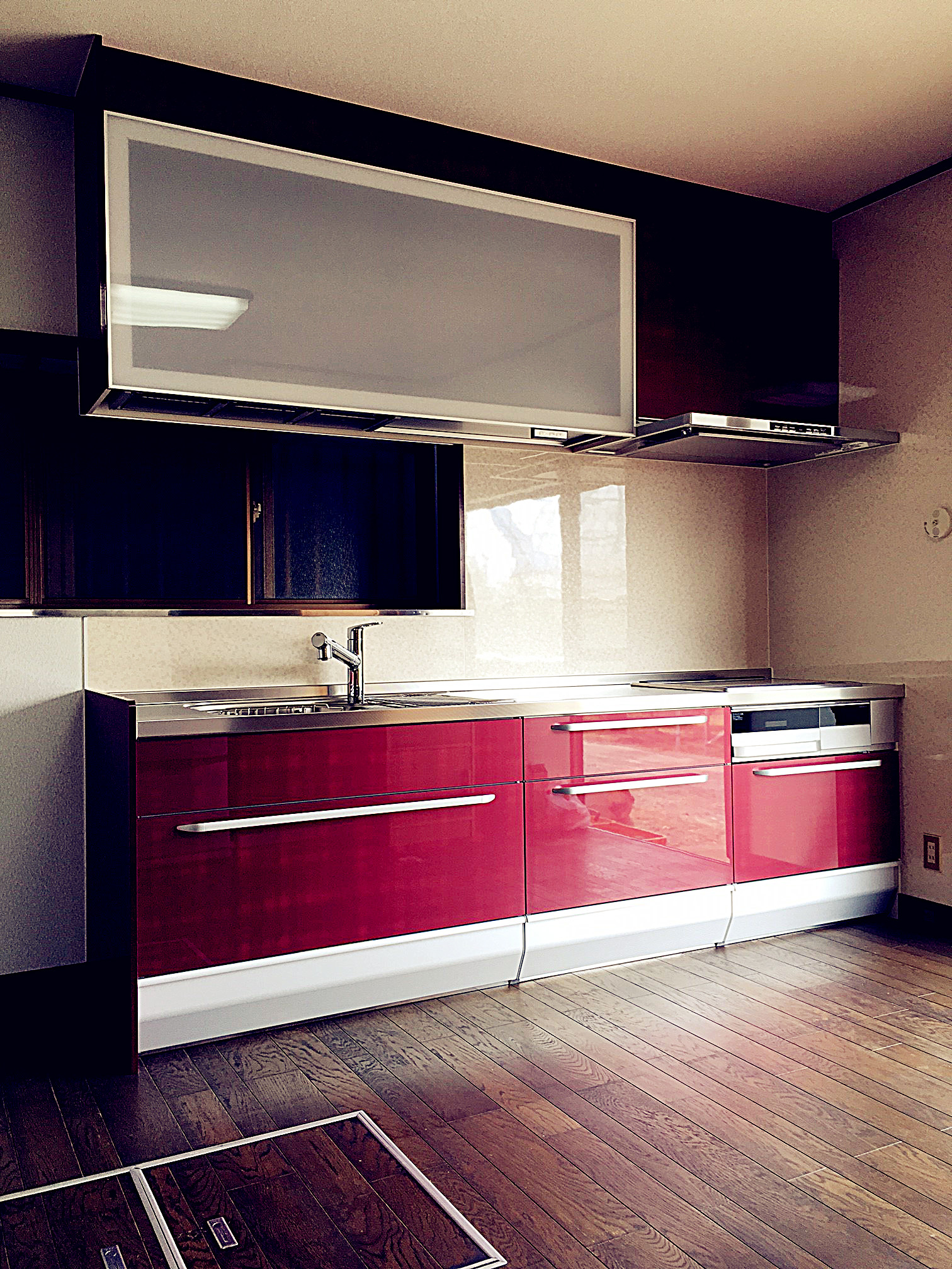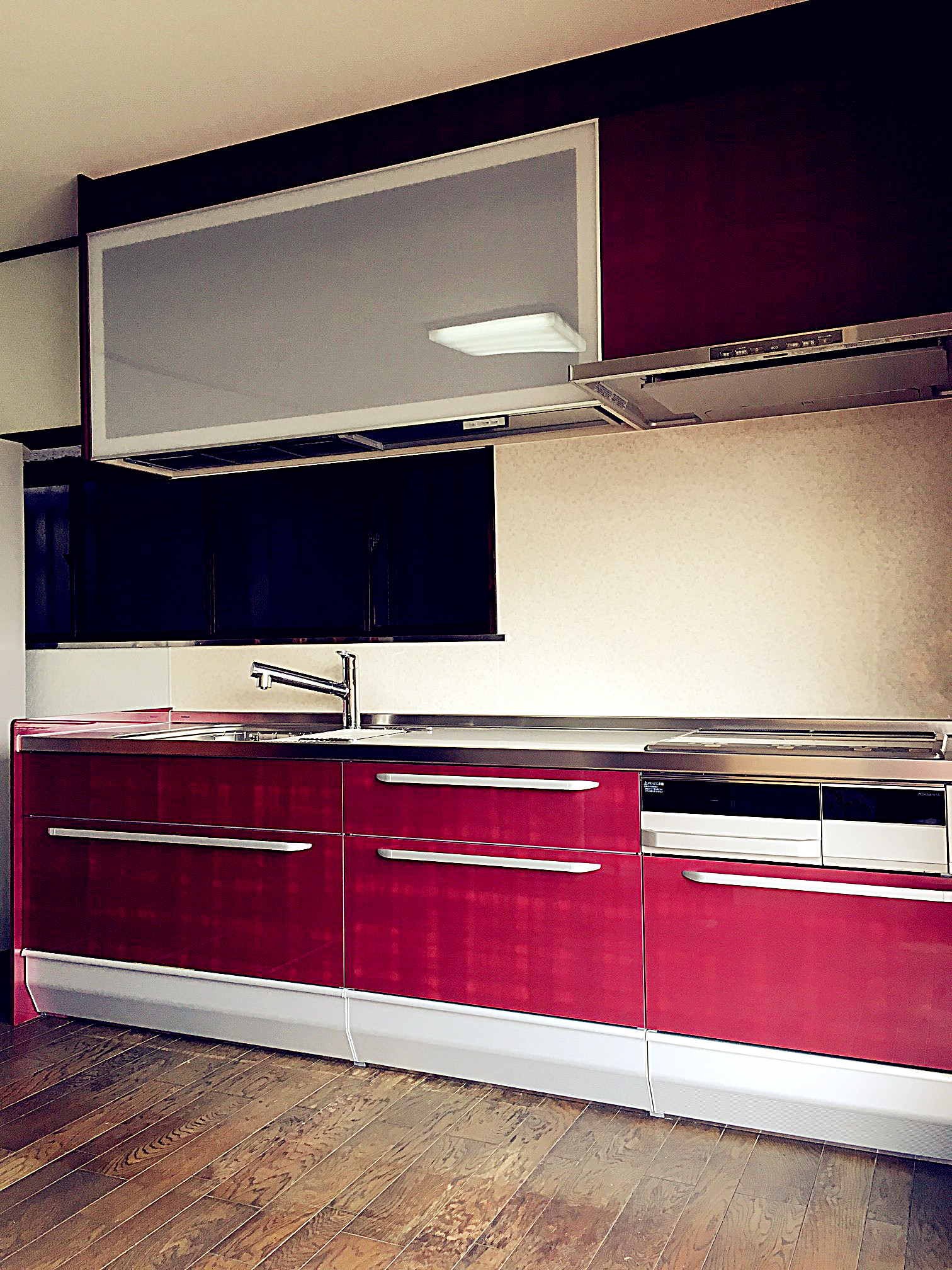 間口が3m以上あったキッチン。足の悪いお母様にとっては、流しとコンロの位置が遠いため、とても使い勝手の悪い状態でした。間口を2.55mにして、ガスコンロだったのを安全で使い方が簡単なIHに変更。吊戸棚は自動で動くもの、掃除が大変なレンジフードは全自動で掃除をしてくれるものを選びました。扉の色がワインレッドなので落ち着きのある空間に生まれ変わりました。