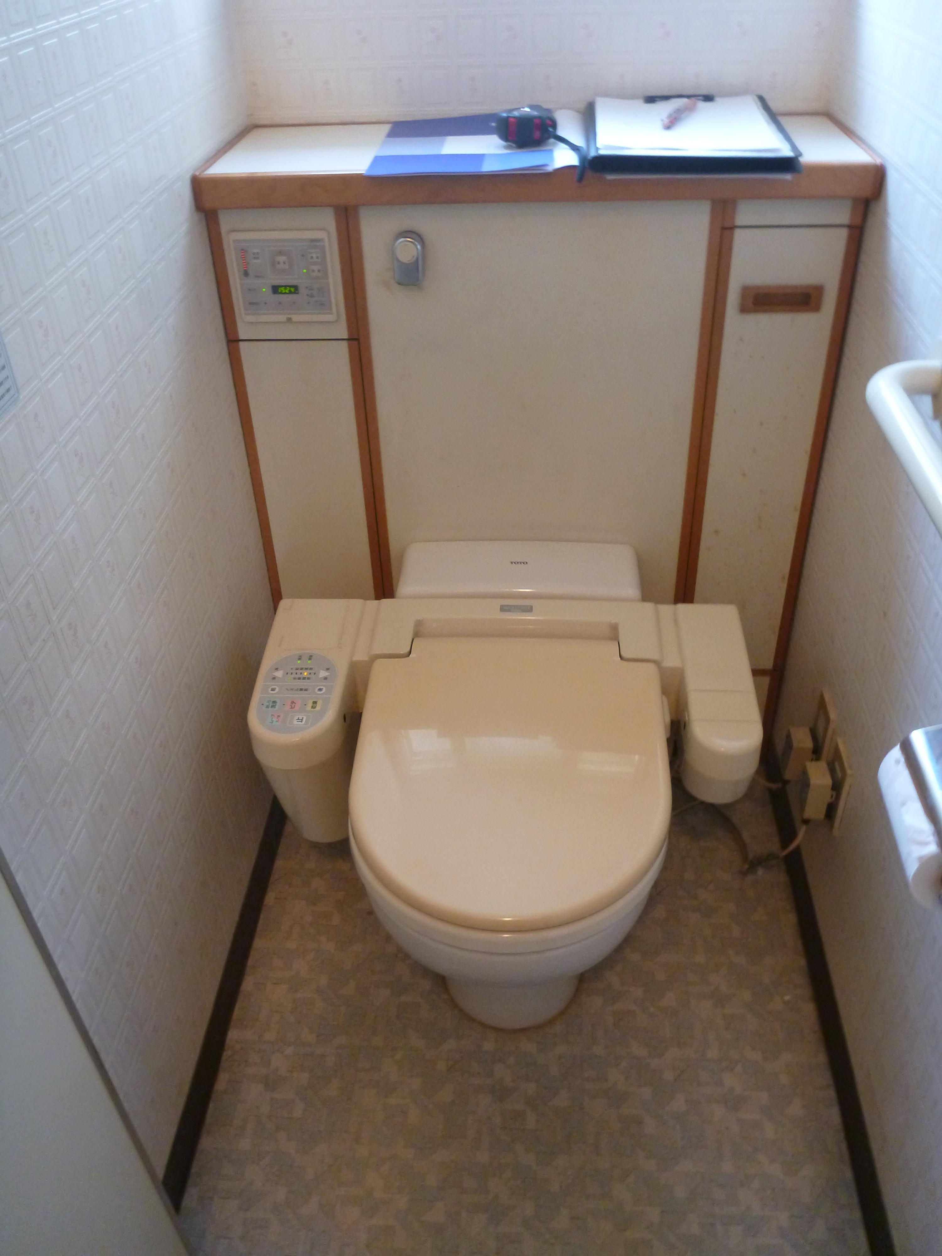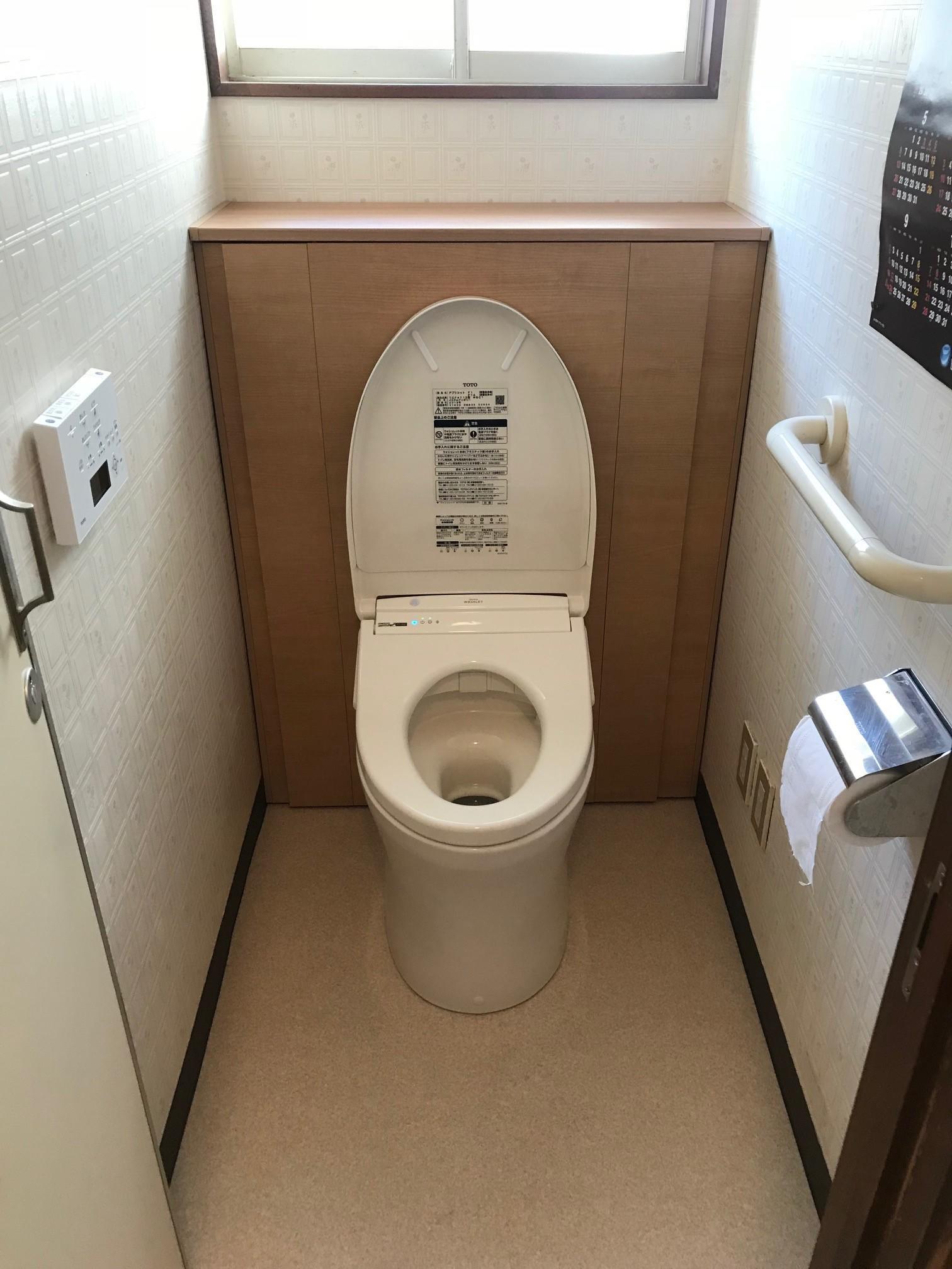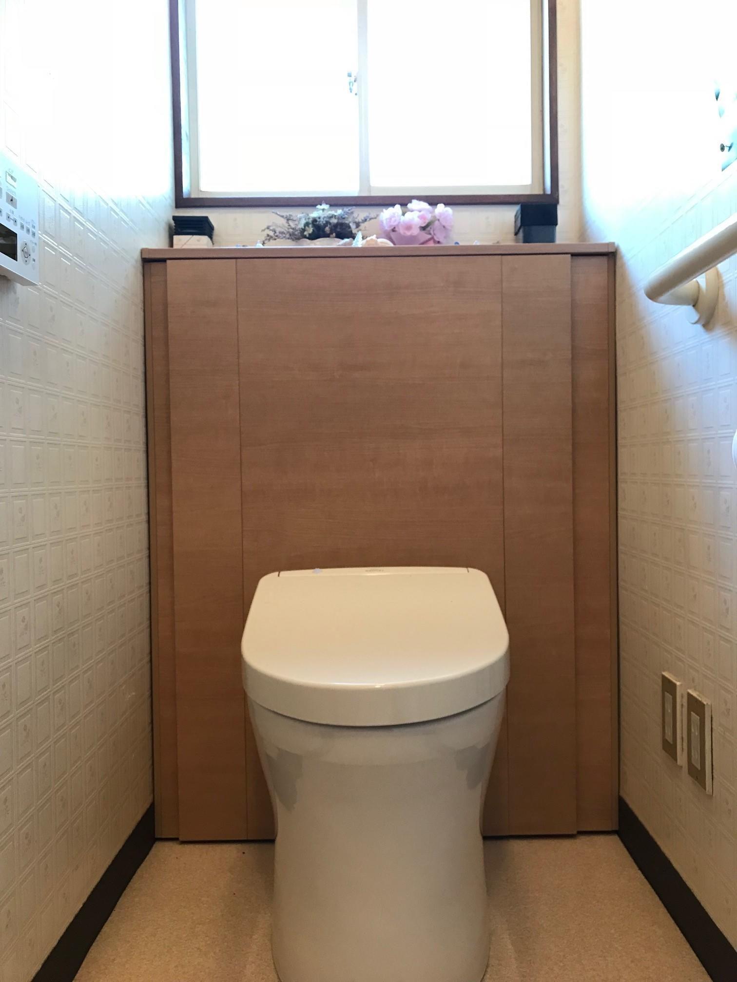 ウォシュレットの故障がきっかけでリフォームを決断。いままでと同じ後ろに収納キャビネットのついている便器を採用しました。両サイドにウォシュレットの大きなリモコンがついていましたが、壁付リモコンになったためとってもすっきりと、収納もしやすくなりました。