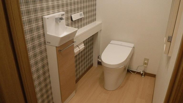 以前のトイレと比べ、コンパクトなトイレと豊富なデザインの手洗いカウンター選択できるLIXILのサティスSで広々とした空間に仕上がりました。 快適にご利用いただけているようで何よりです。