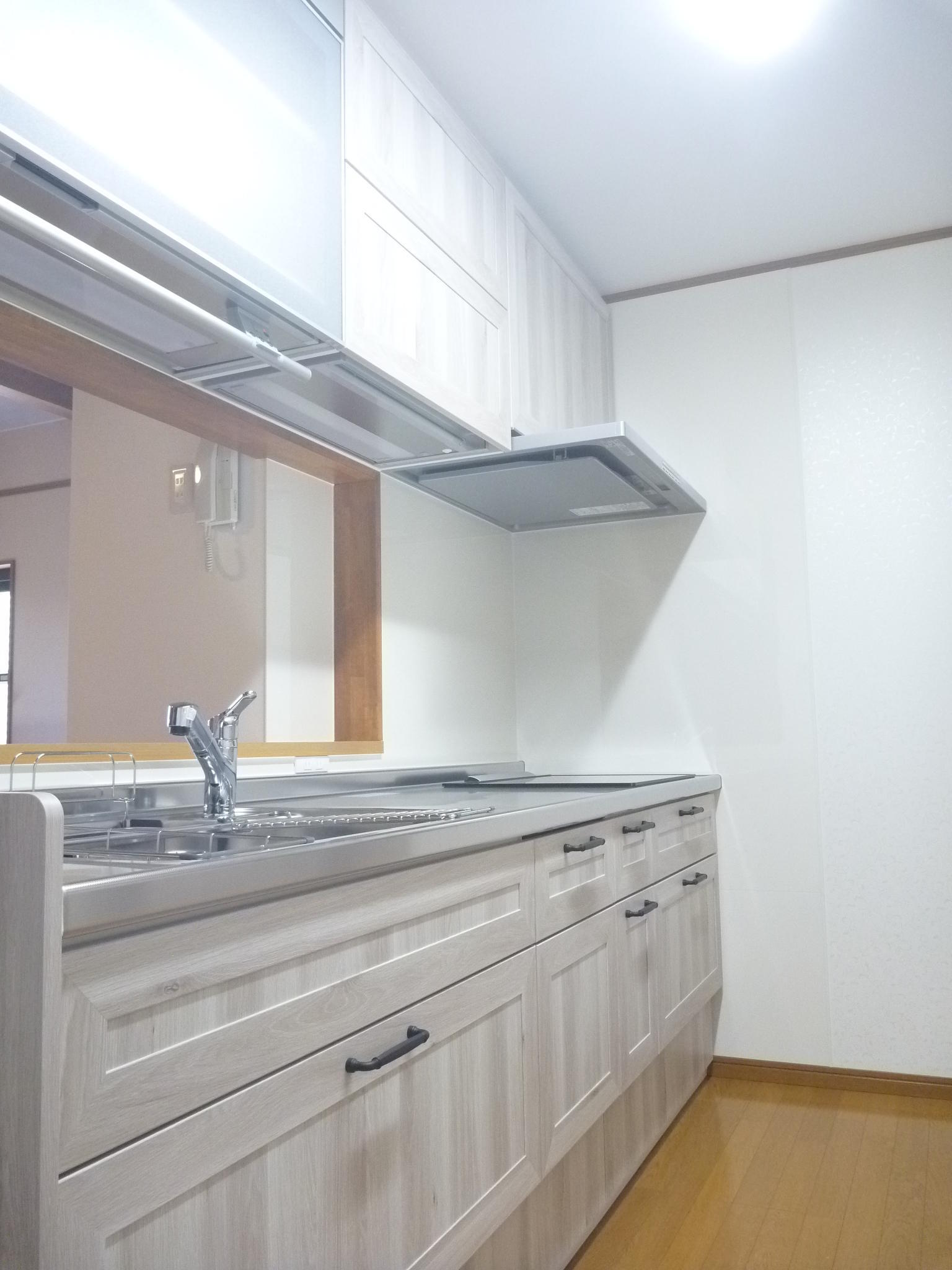 キッチンと背面収納を木目調にし、落ち着いた空間に仕上がりました。