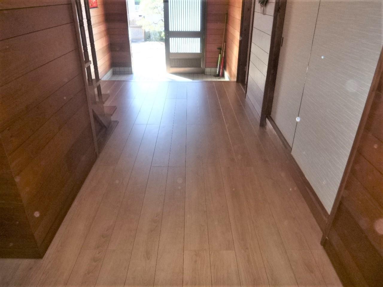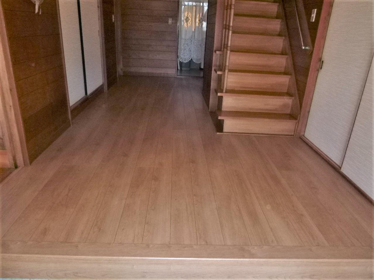 お孫さんたちが階段から廊下に向かいジャンプしたり、たくさん動き回ってしまい床がプカプカしているのでリフォームしたいご依頼をいただきました。床の重ね貼りをし、強度の増す施工をしました。