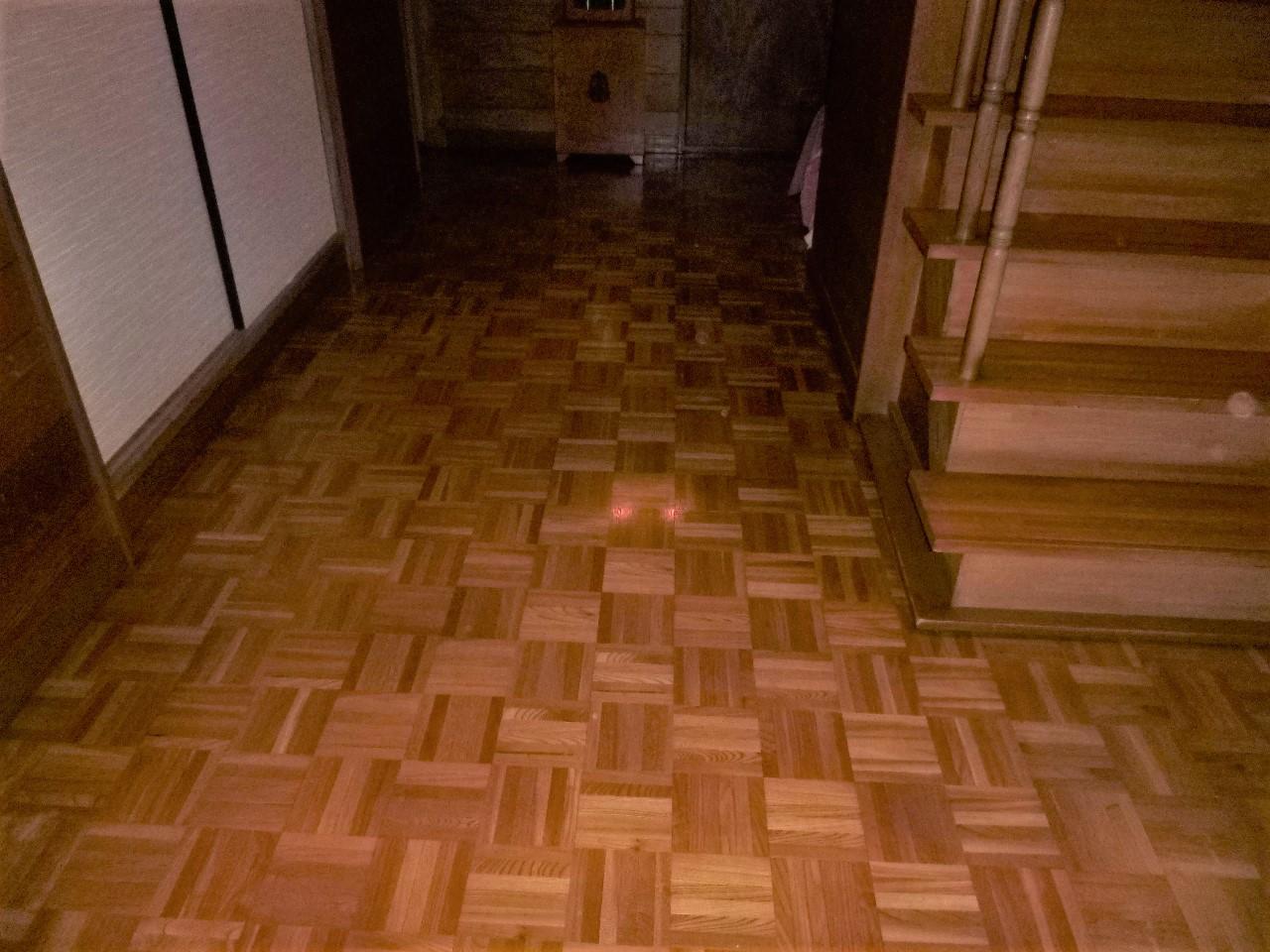 甲府市N様邸、床リフォーム。お孫さんたちが階段からジャンプしたりと、たくさん動き回ってしまい床がプカプカしているのでリフォームしたいご依頼をいただきました。床の重ね貼りをしました。