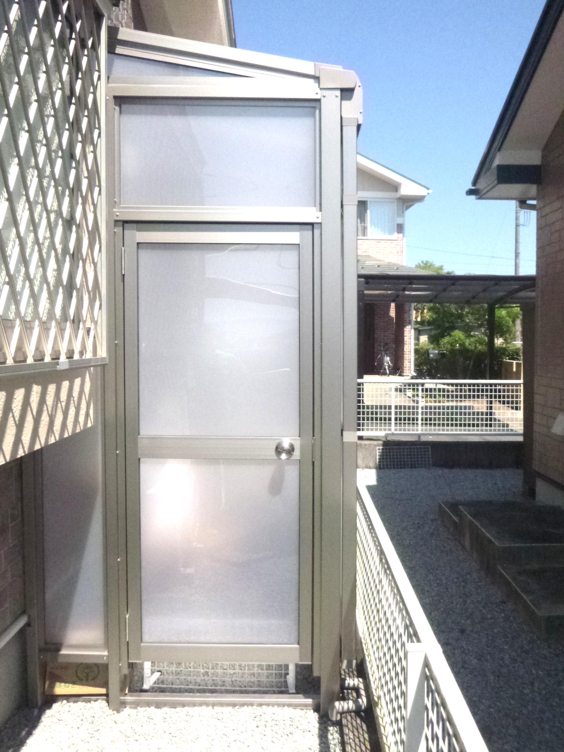 勝手口スペースにストックヤードを設置したいということで施工させていただきました。ゴミなど匂いが気になる物の置き場としても使いたいとのことで設置しました。使い道がたくさんある為、色々な変化に対応できるようになっています。