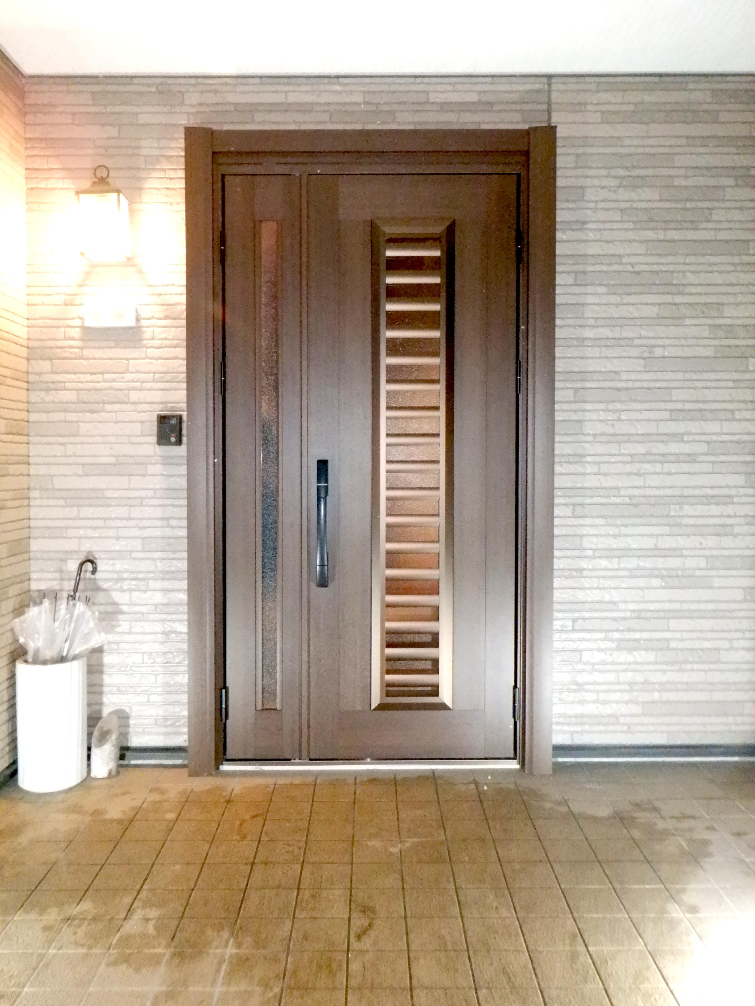 玄関ドアがくつづりに当たってしまい、開け閉めを不便に感じており、ご依頼いただきました。玄関ドアの交換で自宅の印象が大きく変わりました。木目調は上質な印象を与えてくれます。外壁との相性も抜群で、調和のとれた印象に仕上がりました。