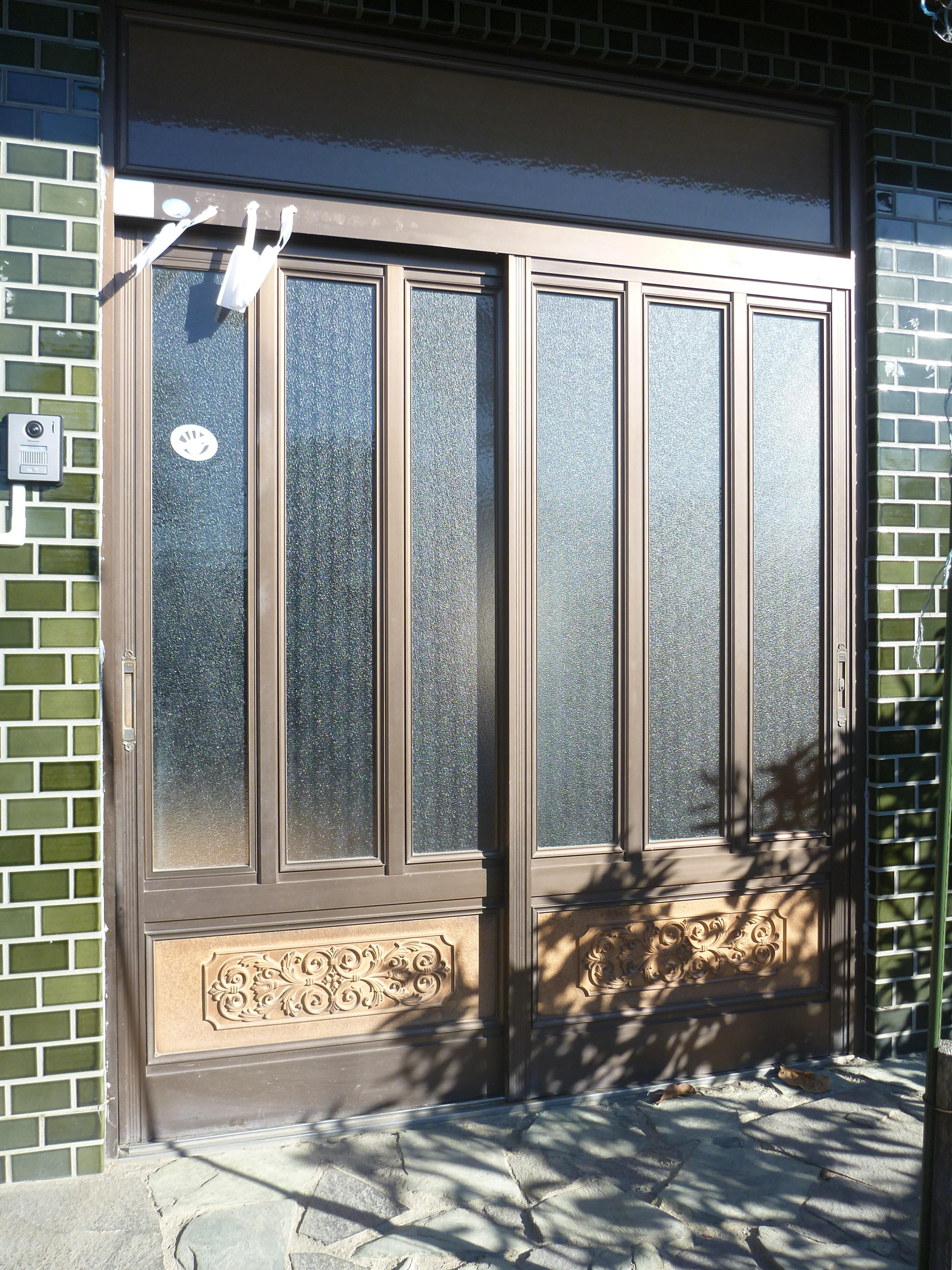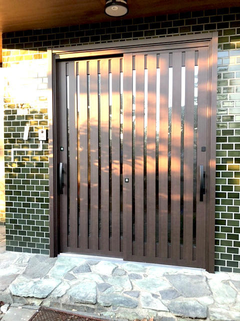 ご自宅を建てた時から使っている玄関は、色々な所が壊れてしまっていました。チラシを見て、リフォームのご依頼を頂きました。今まではランマが付いていましたが、新しい玄関引き戸はランマを付けず大きな扉にしました。ダイアナミックで柿渋調はご自宅にとても馴染んだ色合いの玄関引き戸に仕上がりました。