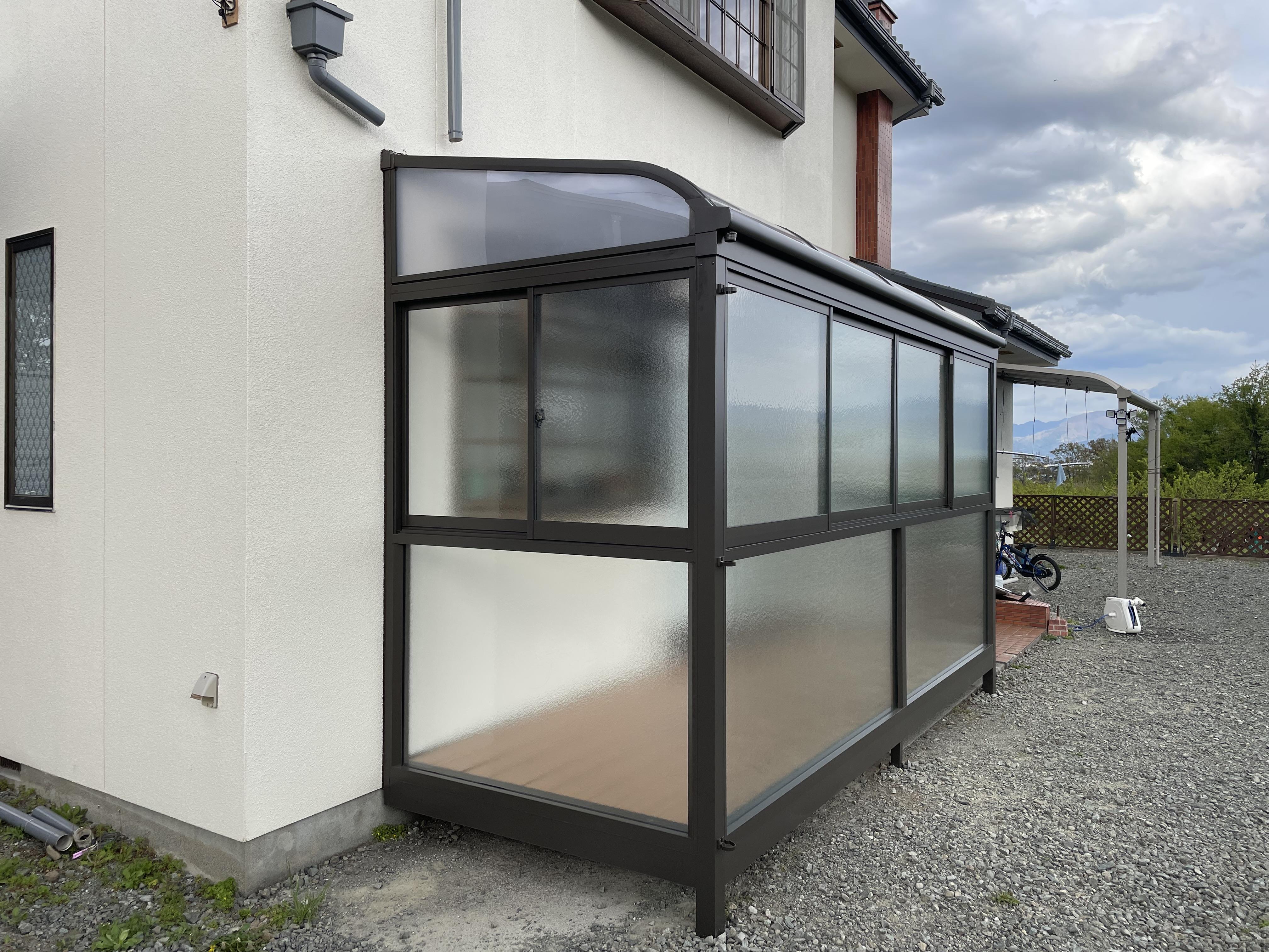 南アルプス市でサンルームの設置工事が完了しました。子育てで洗濯物が多くて、天気を気にしなくてもいい部屋が欲しいとのことでした。洗濯物の悩みをサニージュで解決できました!