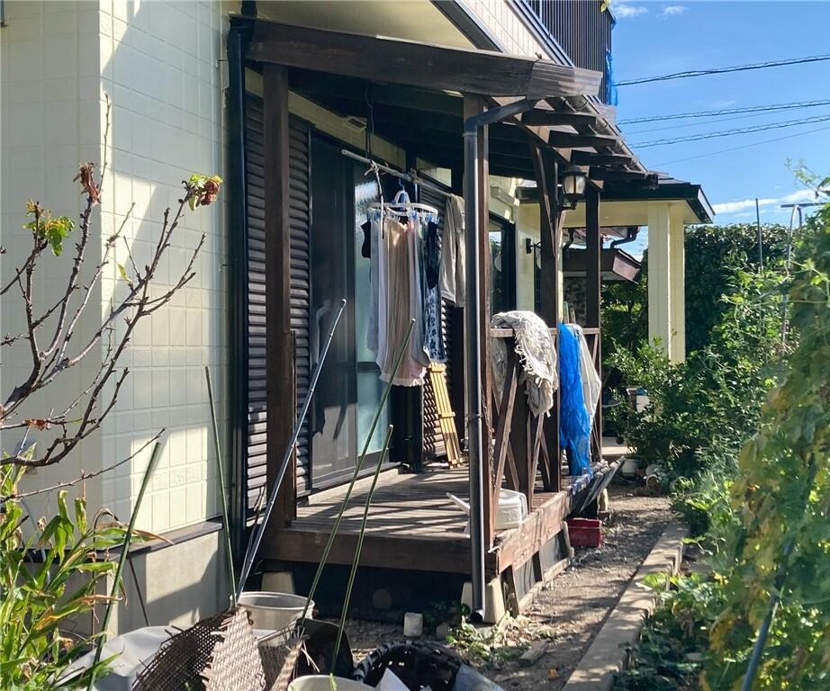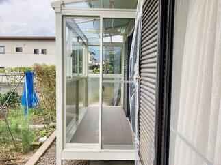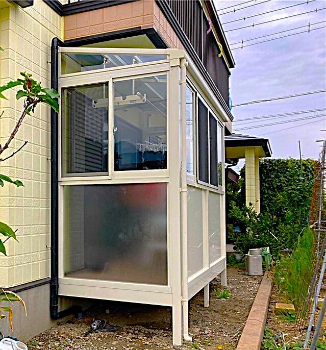 クリーム色の外壁に合った白いテラス囲いが完成しました!奥様のご要望で、目隠しパネルで荷物を置いても隠せるようにし、すりガラスは光も取り入れつつ開放感もある空間にしました。