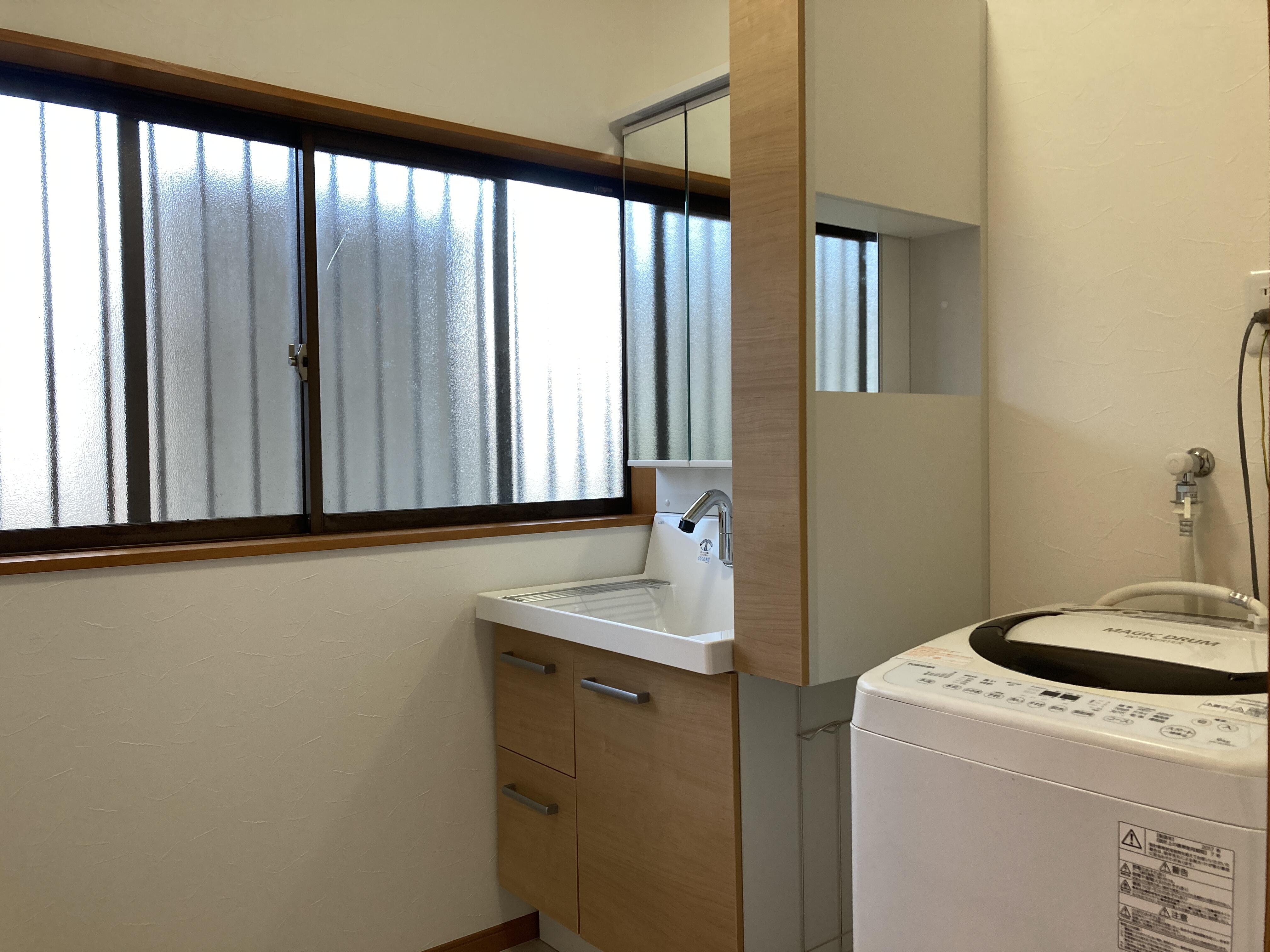 山梨県南アルプス市I様邸のリフォームが完成しました!リノベーションされたお宅にお住いI様より、既存のままだった浴室・洗面脱衣室の改修のご相談をいただきました。在来工法のタイル浴槽は段差もあり、滑りやすいのでお年寄りだけでなくお子様にとっても不安が多いと思われます。わんぱく盛りのお子様にとっても、広くてフラットな床のユニットバスは安心できます。化粧台・洗濯機まわりはキャビネットを選んでいただき、収納力がアップしております。