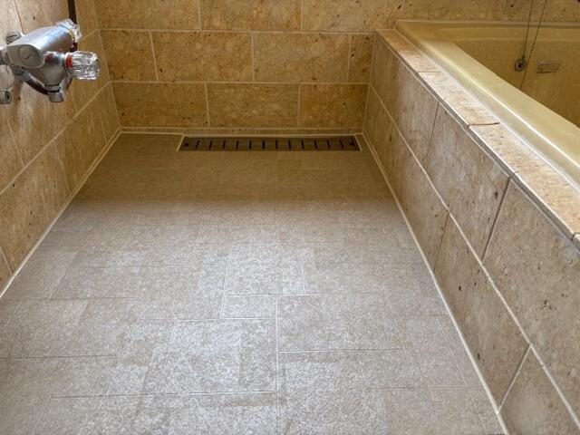 今回は、浴室タイルのコーキングが切れてしまって水漏れが気になる、床のタイルの汚れが気になり強くこすりすぎて水が流れず水溜りができるようになってしまった、というご相談を受けました。コーキングの打ち替えとビニル床シート貼りのご提案をさせていただきました。