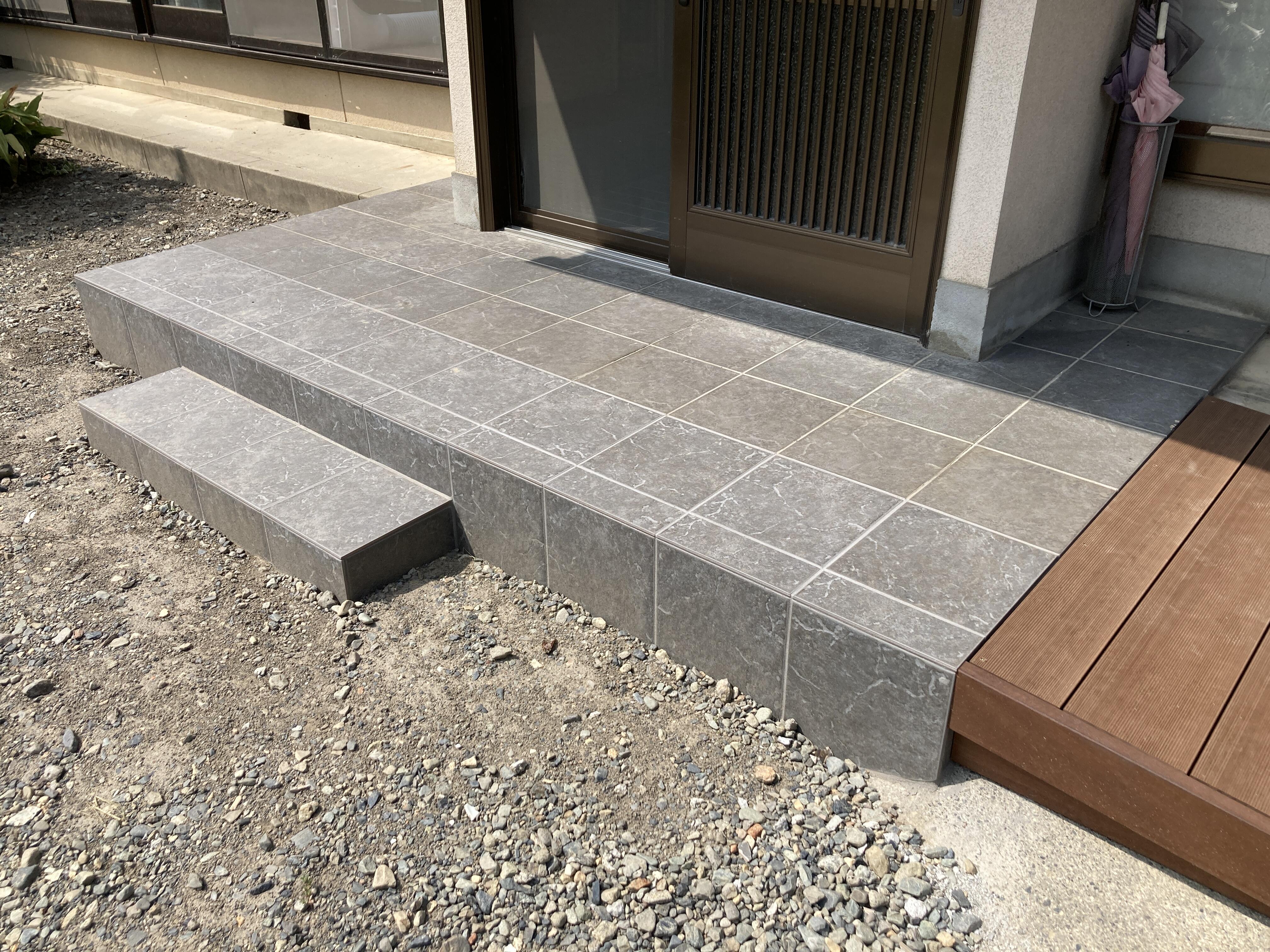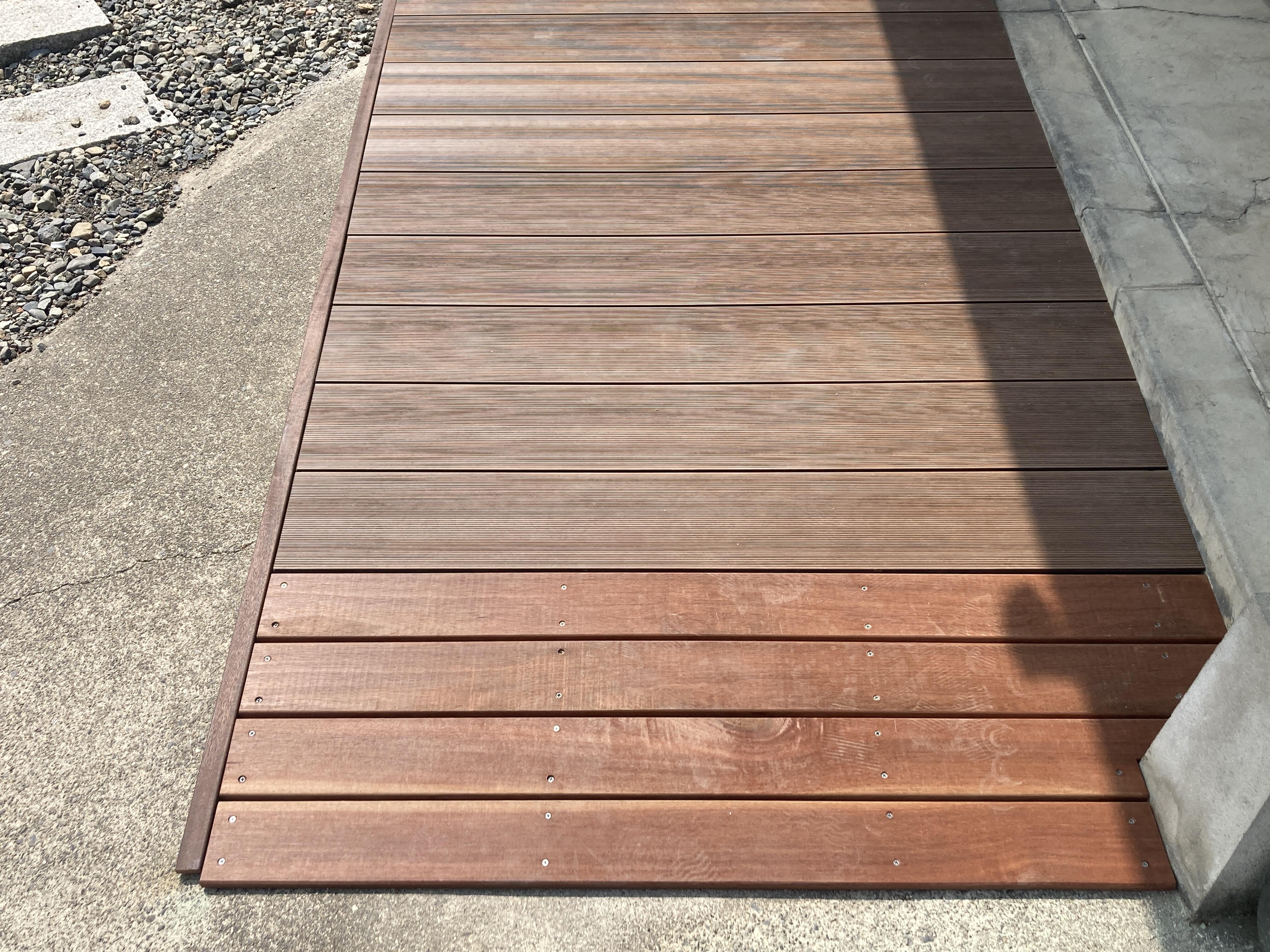 当初はコンクリートとタイルでしっかり作りたいという相談でしたが、金額が高くなってしまったので、デッキでの製作を提案させていただきました。腐りにくい木材を使用しましたのでメンテナンスフリーでどなたでも使いやすい玄関になったと思います。