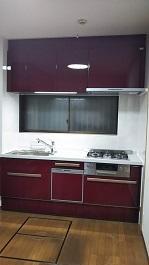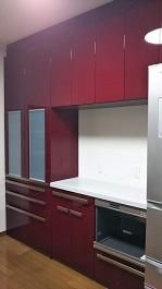 何とも素敵なワインレッドのキッチンとカップボード♡ 鏡面仕上げなので、とても高級感があります。