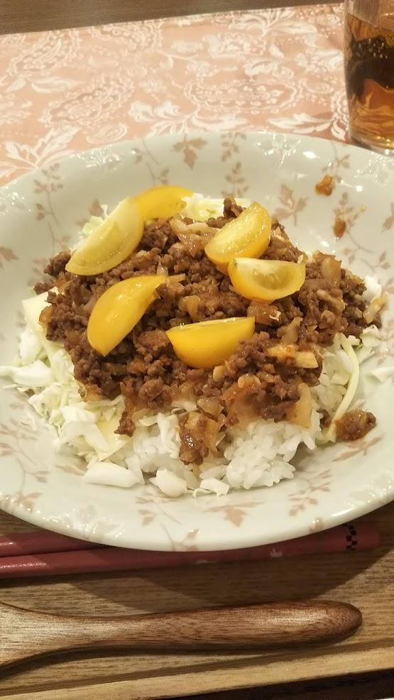 ホットプレートでひき肉と玉ねぎをケチャップで炒めて、タコライスを作ってくれました。