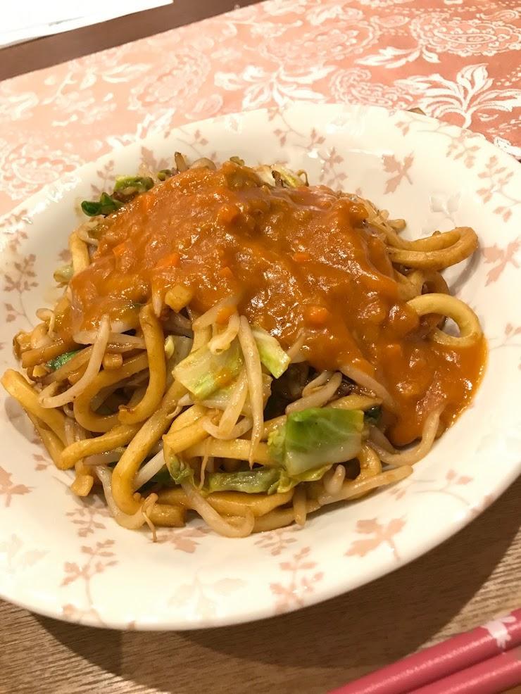 ソース焼きそばの上に、ミートソースをのせて食べる新潟のB級グルメだそうです。