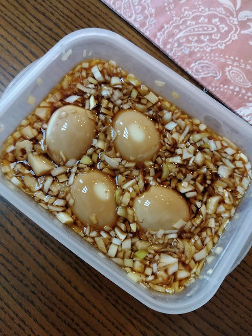 醤油、水、砂糖、唐辛子、いりごま、ネギと玉ねぎのみじん切りに、半熟卵を一晩漬けて作ります。