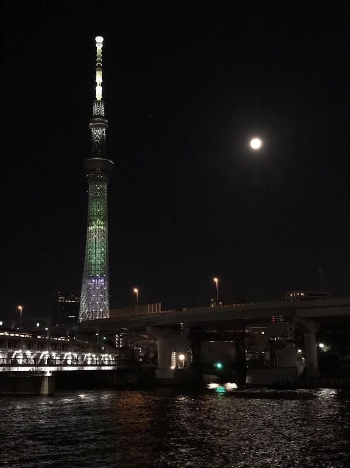 スカイツリーとお月さま。夜は風が涼しくて、川沿いをお散歩しながらとても良い時間がすごせました。