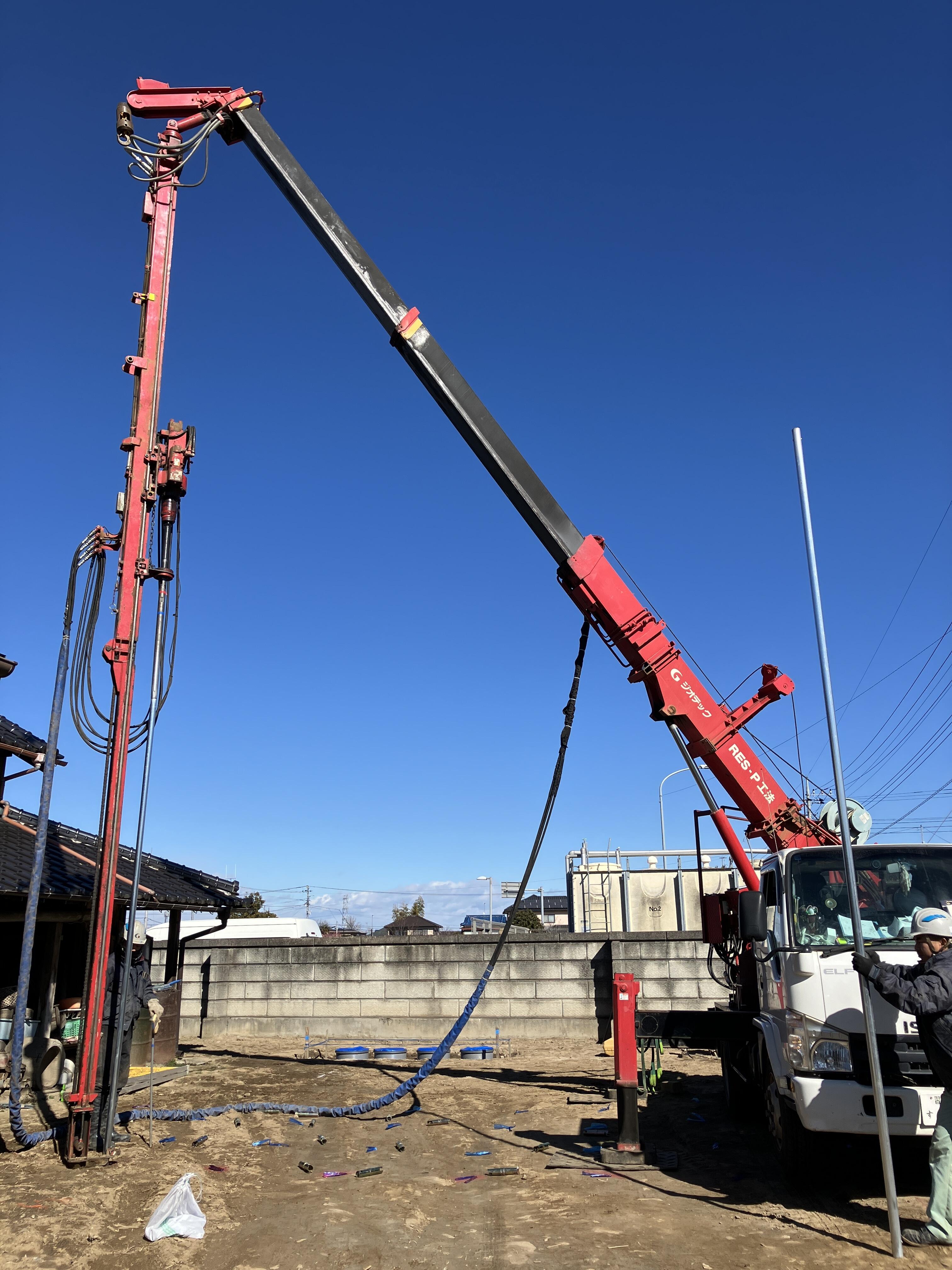 新築工事が始まるT様邸。地盤改良工事の杭打ちが行われるということで見学に行ってきました。