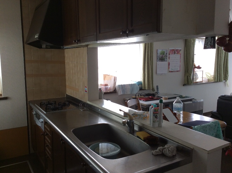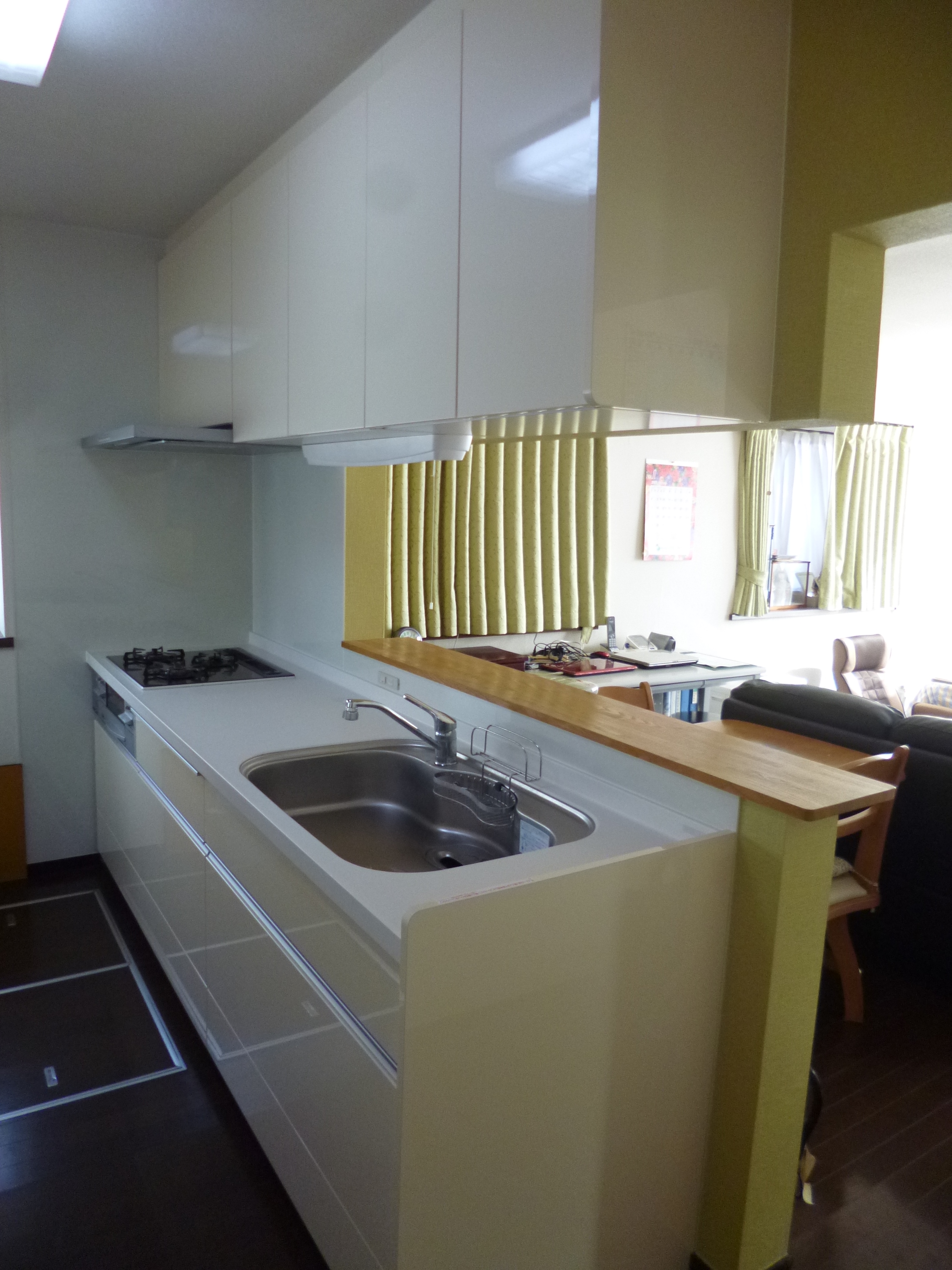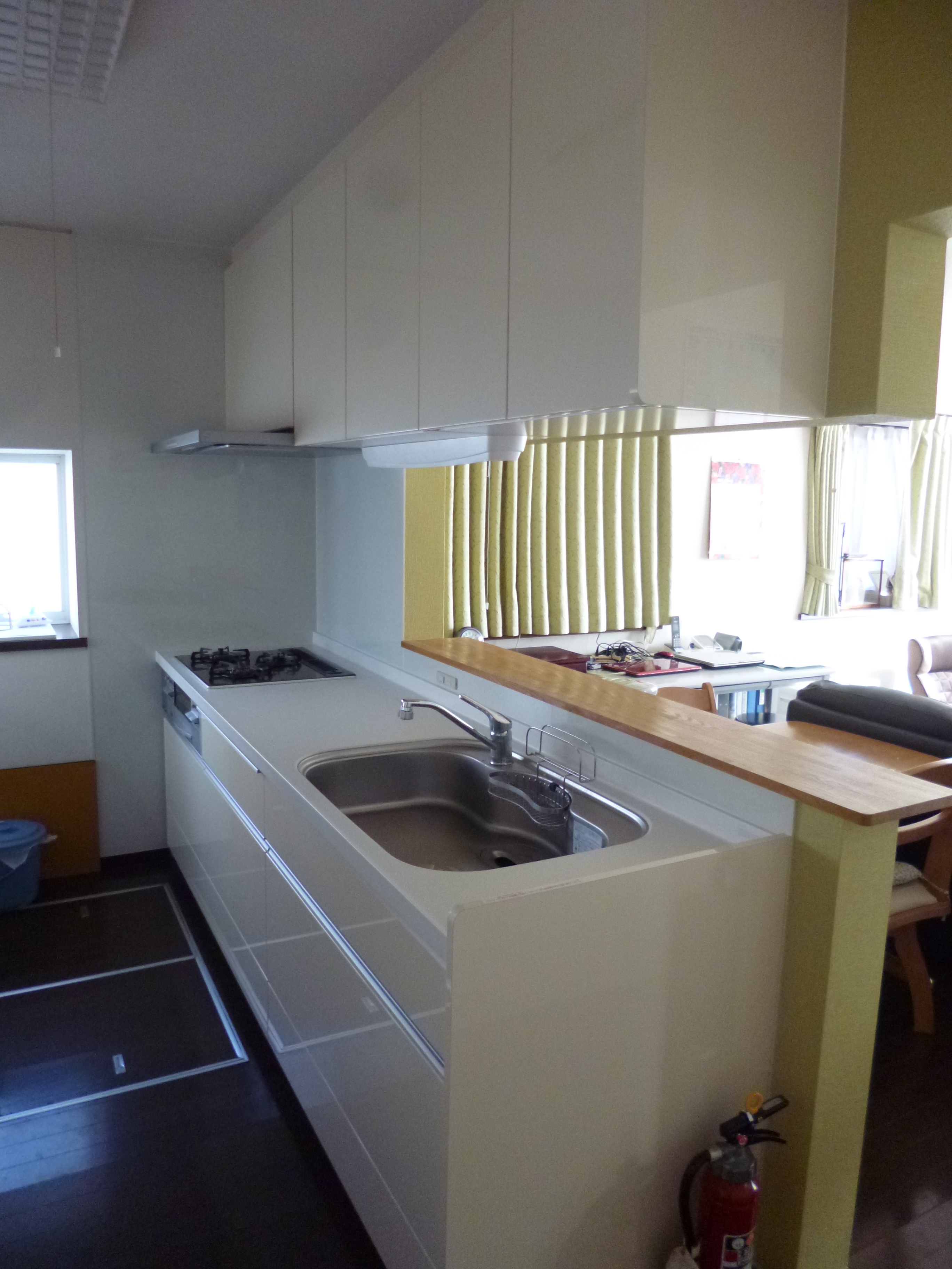 キッチンはLIXILのアレスタ。以前は暗く見えていた台所。キッチンの扉を明るい色にすることで、清潔感もあり、台所もとても明るくなりました。