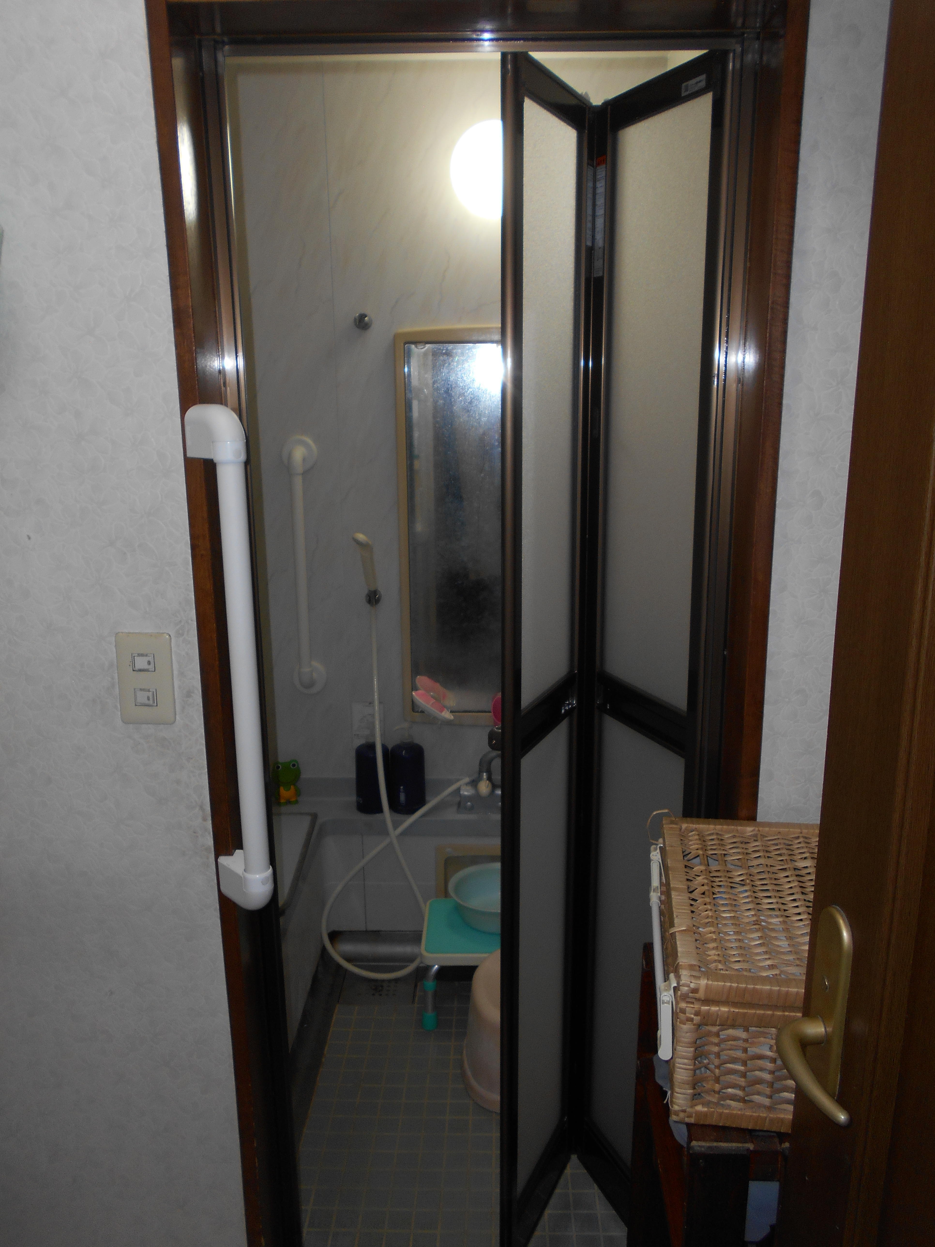 扉が開き戸で開閉する際に体を反らしたり、身体に負担が掛かることがあった。他にも介護保険で購入したシャワーチェアを利用しているが、開き戸なので洗い場のスペースが狭くて困っている。とのお悩みでした。