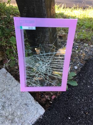 こちらは、防犯ガラスのサンプルを実際割りました。