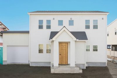【インナーガレージと白い塗り壁の北欧の住まい】