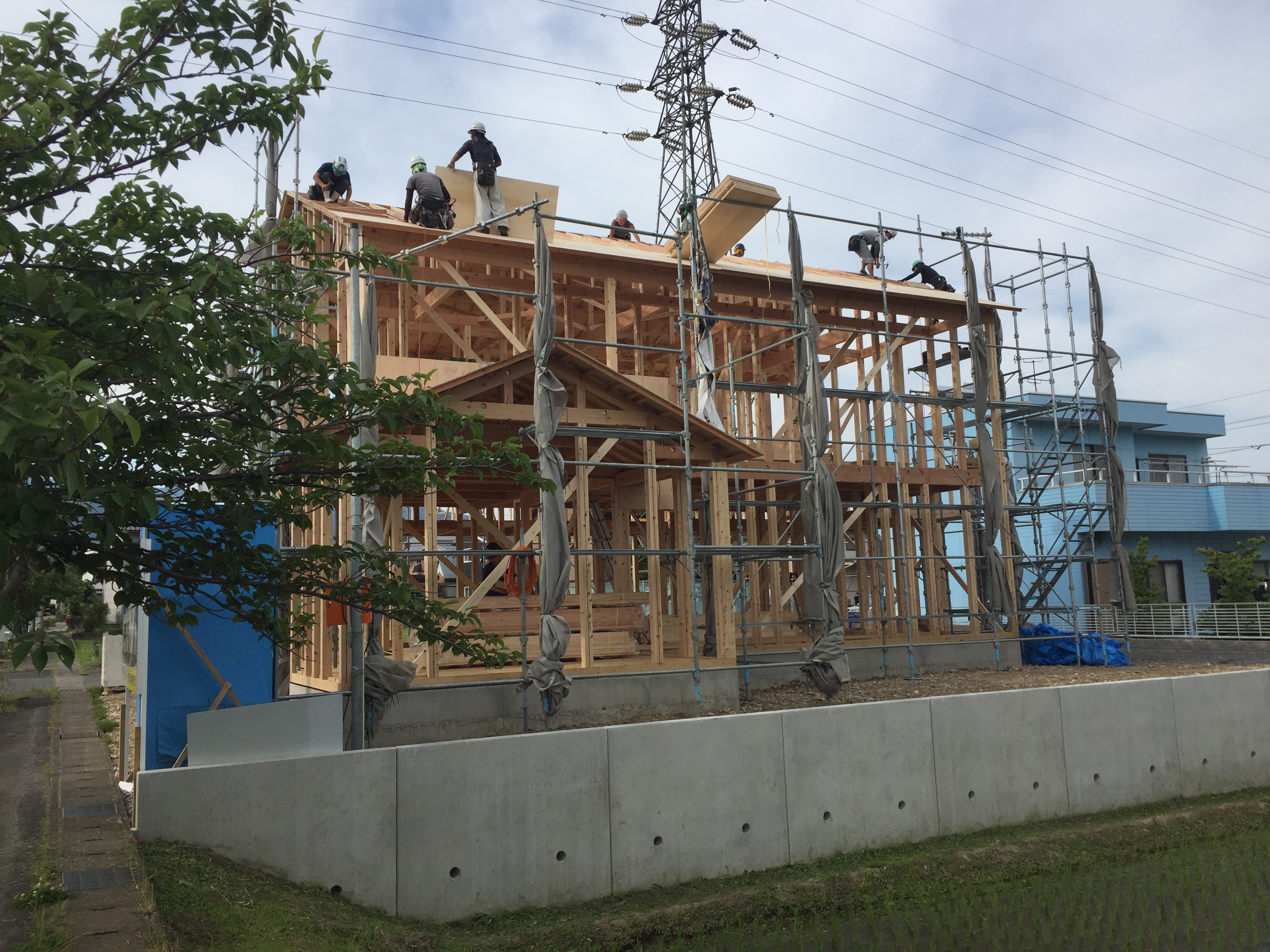 日曜日は雲一つない炎天下の中、新築現場の上棟式を迎えました。