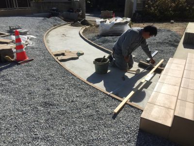 アプローチタイルや土間コンクリートが仕上がり、工事も終盤にさしかかっております。