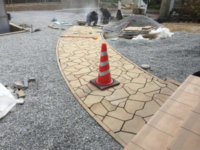 今回玄関までのアプローチには、乱張りタイプの石張りをスロープの様に施工していきました。