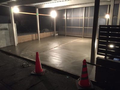 カーポートの土間コンクリートは打設後、最後に表面を押えて仕上げていきます。