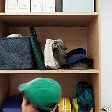玄関の近くにこんな身支度スペースがあったら、夏休みの間も収納に困りません。