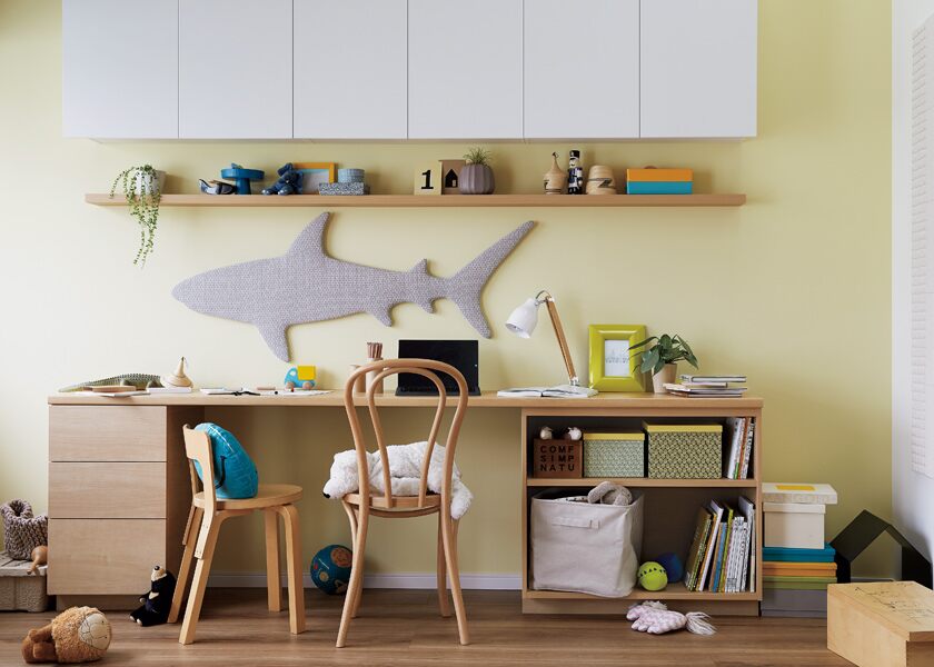 大人が使う仕事の書類は上のキャビネットに、子供の勉強用具はデスク下にと、