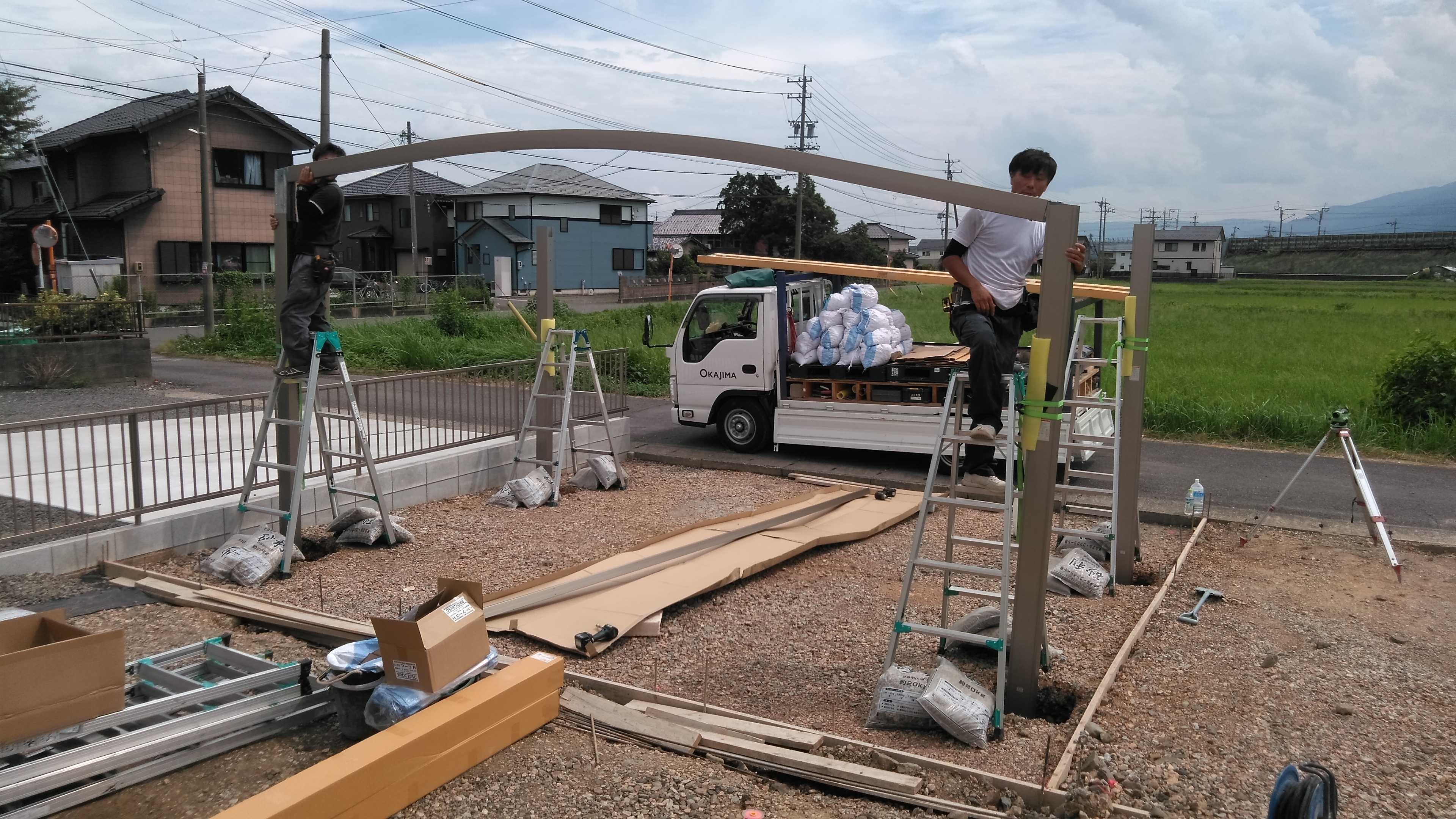 外部では、外構工事も始まっており只今カーポート設置中となります!