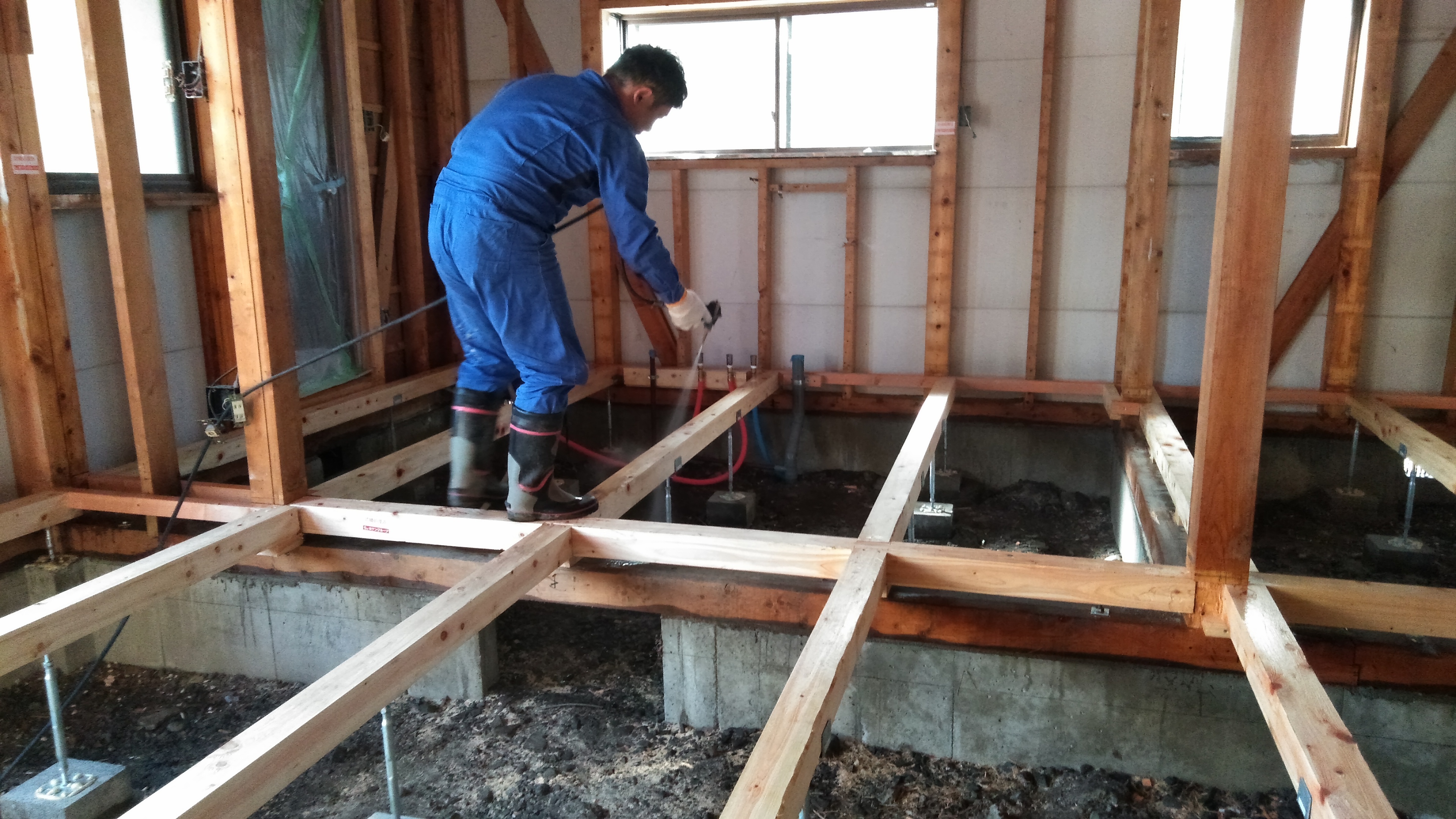 床組が終われば、シロアリ予防の防蟻工事をしていきます。