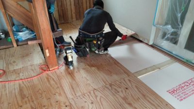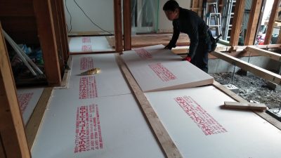 次に下地である厚さ24㎜の合板を敷いて、床組下地は完了です。