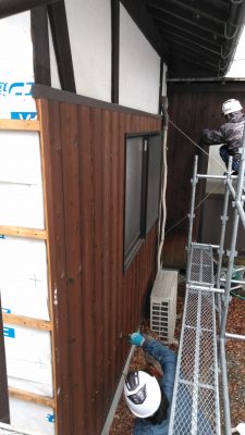 現状は木の羽目板が張ってあり、それをめくり撤去して防水紙を貼り新しく角波板金を張る工事になります。