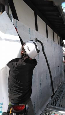 足場設置しましたら、現状の外壁を撤去し、防水紙を新たに張っていきます。
