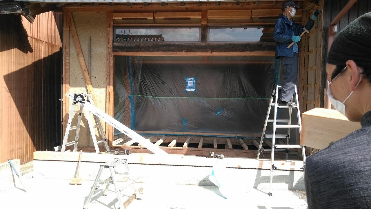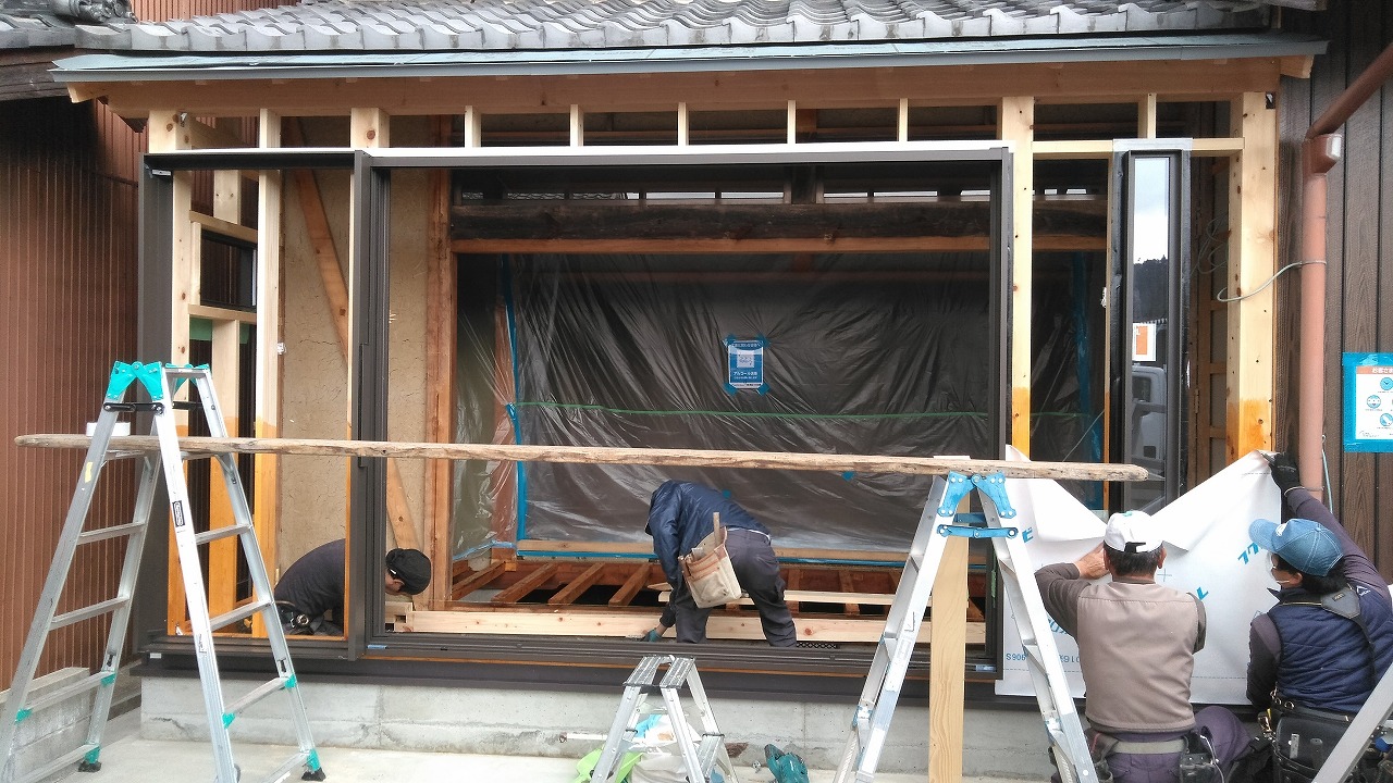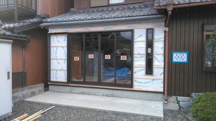 サッシを取り付けたら屋根・壁共に雨水の侵入を防ぐ為のシートを貼っていきます!