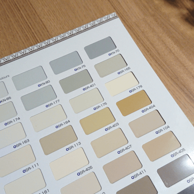 先週、水廻りの話をさせていただきましたが、カラーサンプルを見ても全体に塗った時のイメージは掴みづらいと思います。 ちなみに、外壁の場合はこのようなサンプルです。