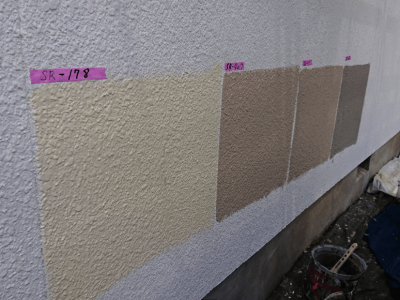 色の数が多く、光の当たり具合でも色が違って見えるので迷ってしまいますね。。 そこで、いくつか候補を選んでいただき、実際に塗ったものを確認して最終決定します。