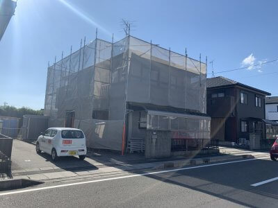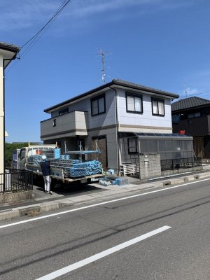 立派なテラスが取付してありますので、屋根を一部外しての足場設置になります。