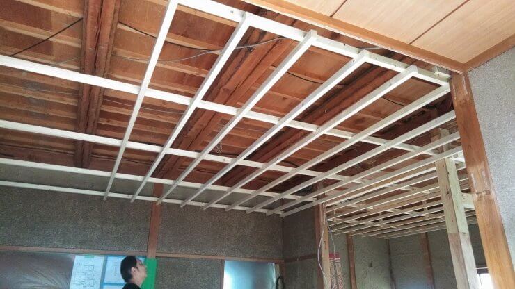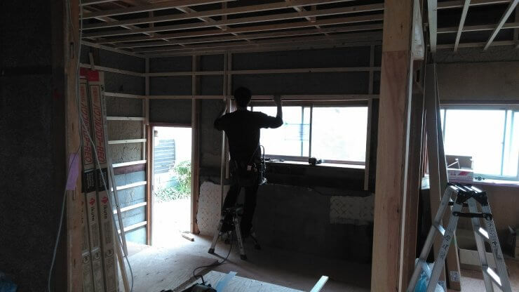 床下地が完了すれば、次は天井・壁の下地組へと入ります。