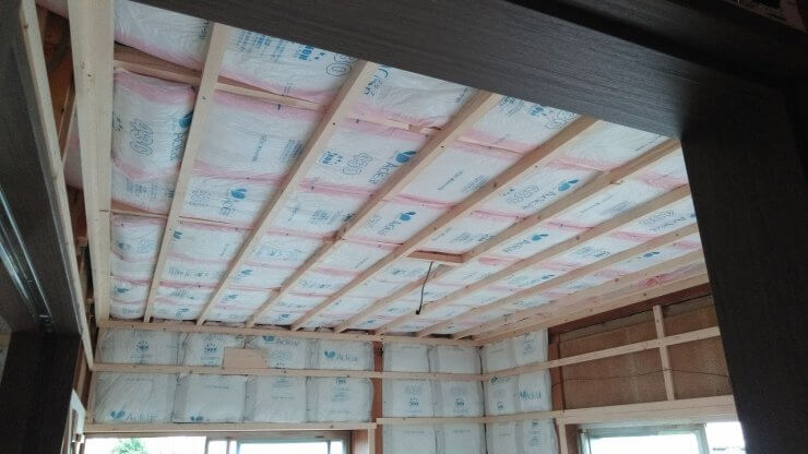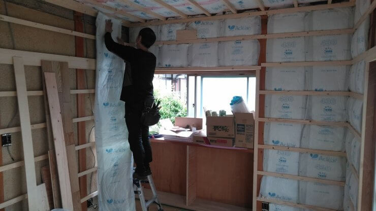下地が完了すると、天井・壁にも断熱材をしっかり敷いていきます。