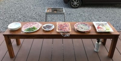お庭バーベキューでは、このように、ふだんダイニングで使っているベンチを
