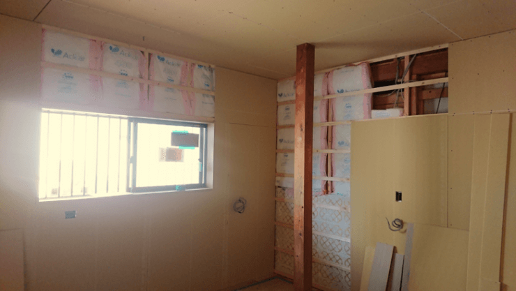 写真は壁の下地を貼っている途中です。右側の壁には断熱材が入っているのが見えますね。 クロスまで張り終えたら、左側の窓の下に新しいキッチンが入ります。