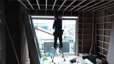 1回目の今日は、サッシ窓入替・天井ボード張り・内部枠と下地施工がメインとなります。