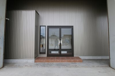 【玄関】・・・ 角波板金の色にしっくりくるカッコいい趣きですね。