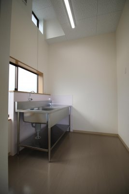 【給湯室】・・・ 背面の壁にはキッチンパネルも貼り、お手入れも簡単です。